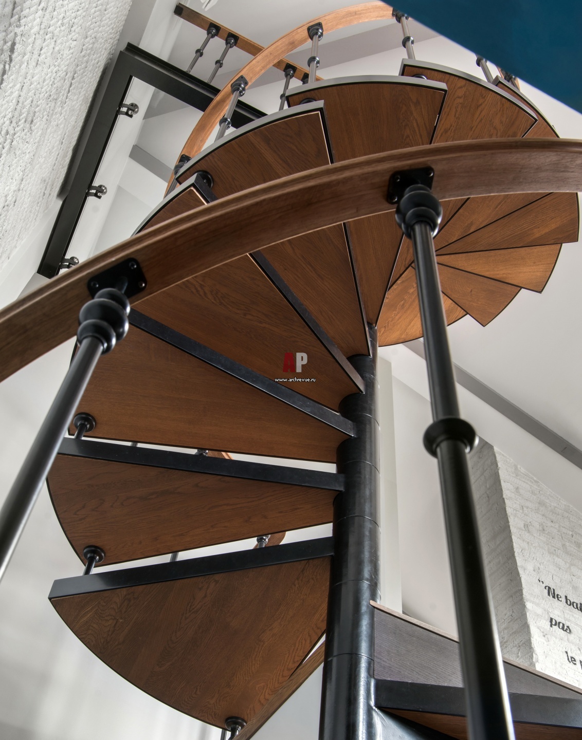 Мансардная квартира в ЖК «Николаевский дом». Винтовая лестница ведет на антресольный этаж.
