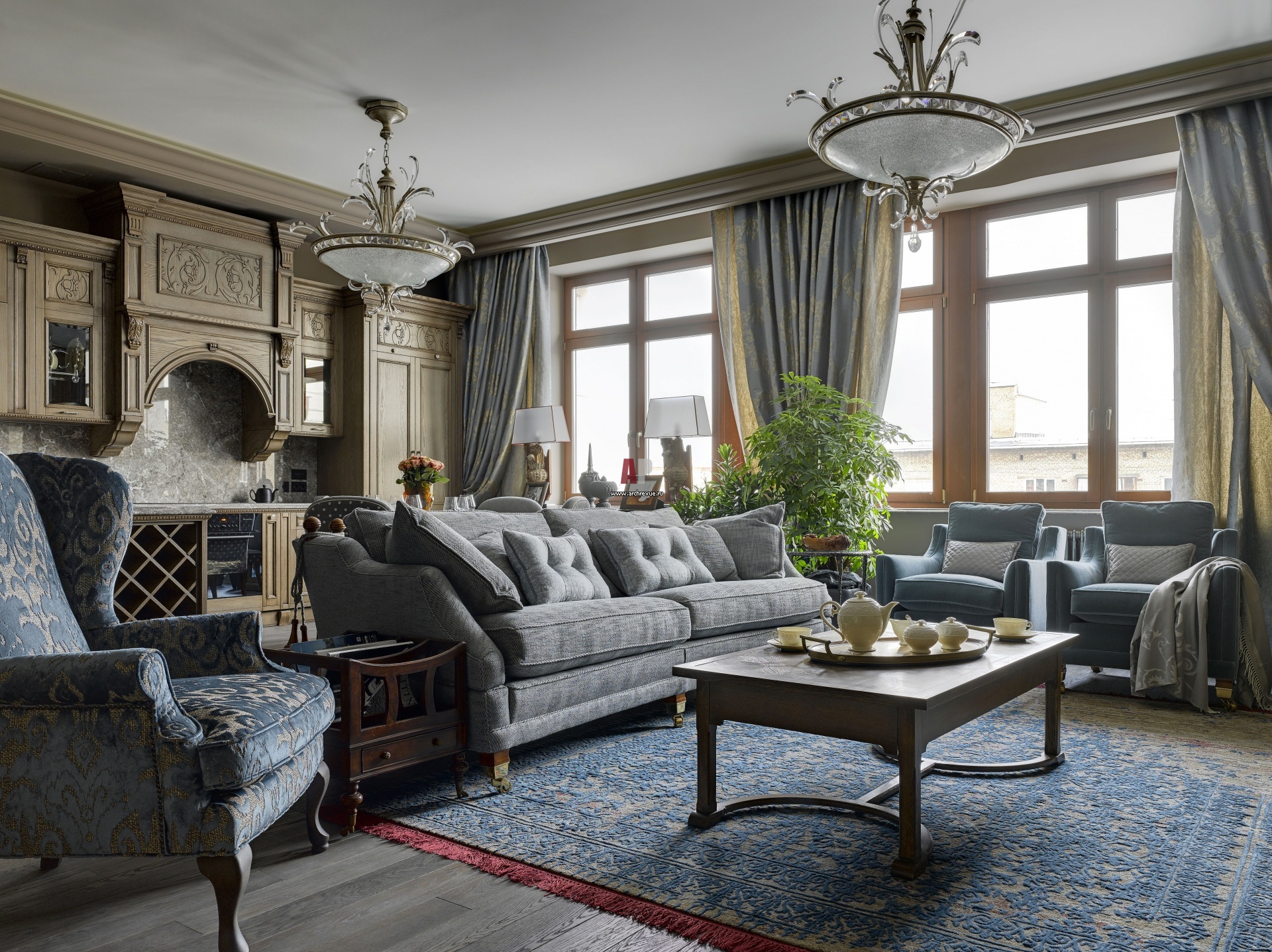 Интерьер парадной квартиры в классике с итальянскими мотивами. Комод, журнальные столики, Jonathan Charles. Диван, Duresta. Люстры, Fine Art Lamps.