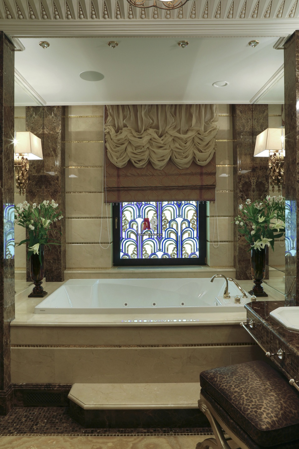 Ванная комната в стиле ар-деко. Ванна с мраморным подиумом примыкает к окну. Потолок украшен авторской лепниной.