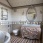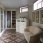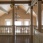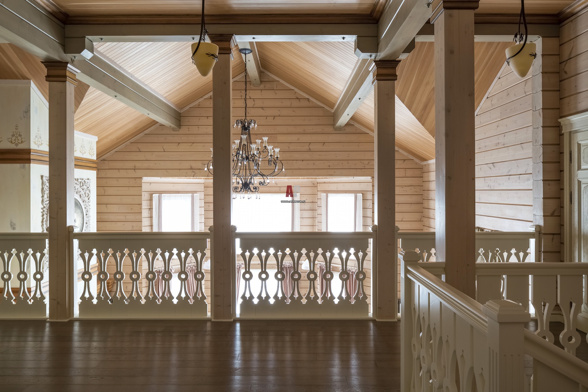 Холл второго этажа. В оформлении стен использовались лессировочные составы, сквозь которые хорошо видна текстура дерева. Конструктивные элементы выделены серо-оливковым цветом, потолок подшит кедровой доской, для стен подобран теплый природный оттенок, для плинтусов, ограждения балкона и лестницы – белый.