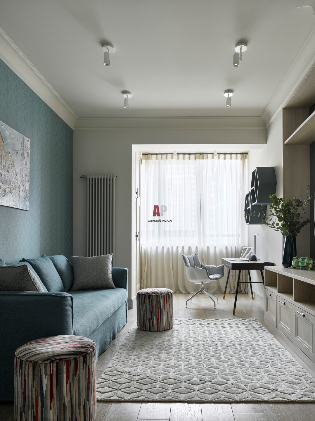 Комната сына увеличена за счет присоединения лоджии. Стена за диваном акцентирована обоями Eco Wallpaper (коллекция Reflections) насыщенного бирюзового цвета. Диван, Meridiani. Пуфы в ткани Romo, на заказ.