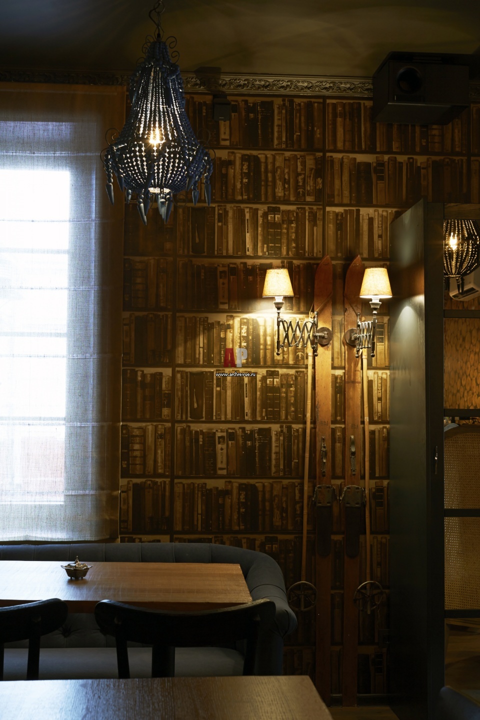Обои Andrew Martin с рисунком в виде библиотечных книжных полок, а также классические люстры из серного стекла отсылают к традиционному английскому кабинетному стилю.