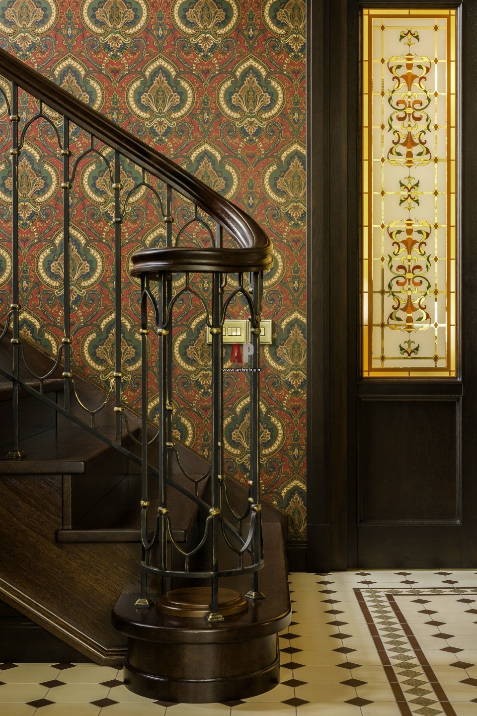 Ограждение лестницы в готическом стиле выполнено из патинированного кованого металла.