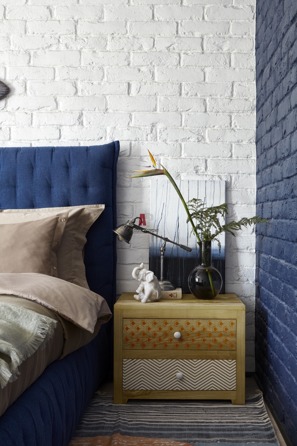 Любимый цвет хозяйки – темно-синий. Он использован как акцентный и эффектно смотрится на фоне белых кирпичных стен.