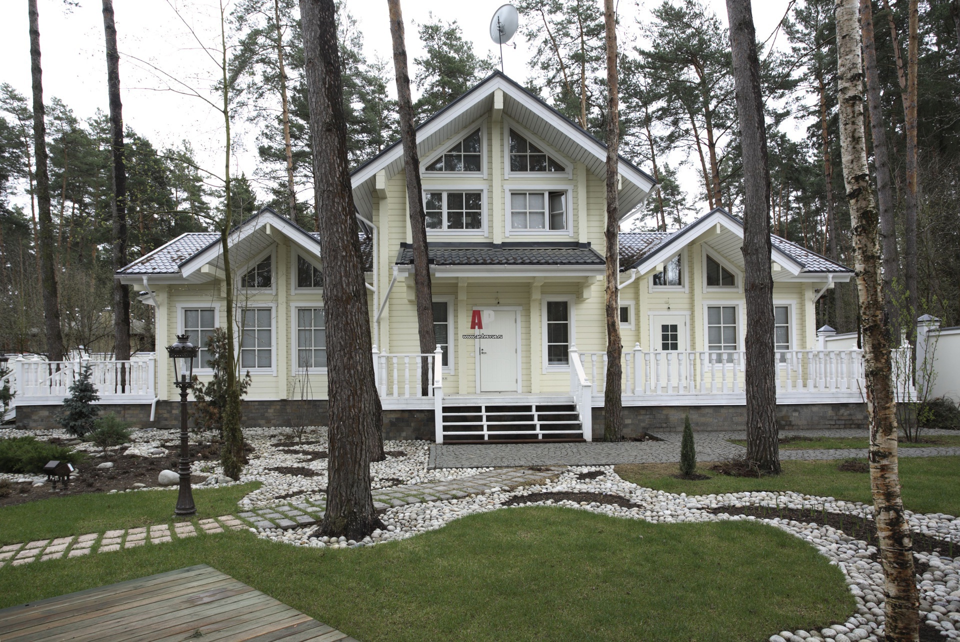 Баня построена из клееного бруса по технологии безусадочной сборки бруса. В гостевых помещениях первого и второго этажа – панорамные окна. Для отделки фасада использовано полуматовое покрытие Rubbol Satura PLUS, производитель Sikkens, поставщик «Дом Краски / Деко – Эм». Оно хорошо выравнивает поверхность и позволяет избежать появления царапин.