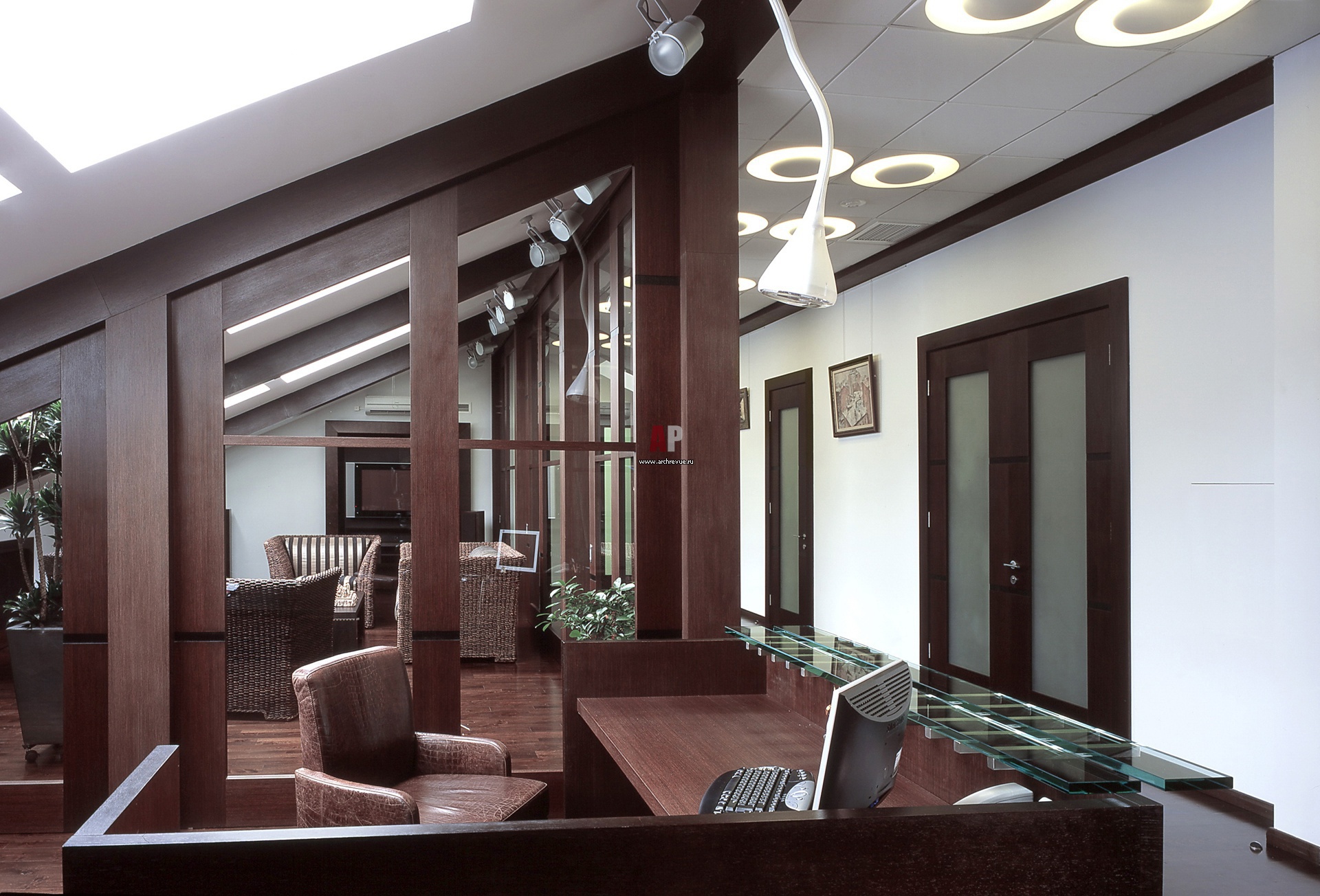 Приемная при кабинете руководителя. Деревянные перегородки из стекла, на заказ. Современные светильники, поставщик «Группа MODUL».