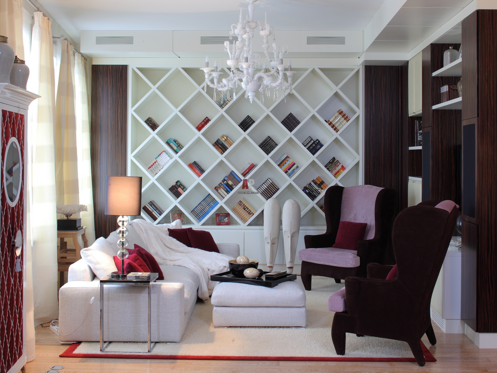 Доминанта гостиной – библиотечный стеллаж с отсеками-ромбами. Он выполнен по эскизам авторов проекта, изготовление «Александр Ней». По бокам стеллажа расположены пилястры из эбенового дерева, они выполняют роль систем хранения. В другую пару пилястр встроены акустические динамики.