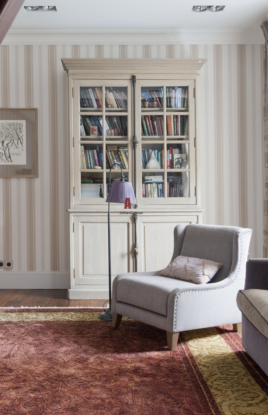 Библиотечный стеллаж в приватной гостиной выполнен в стиле Прованс. Обои в полоску. Низкое кресло тканевой обивкой. Металлический торшер с тканевым абажуром сиреневого цвета.