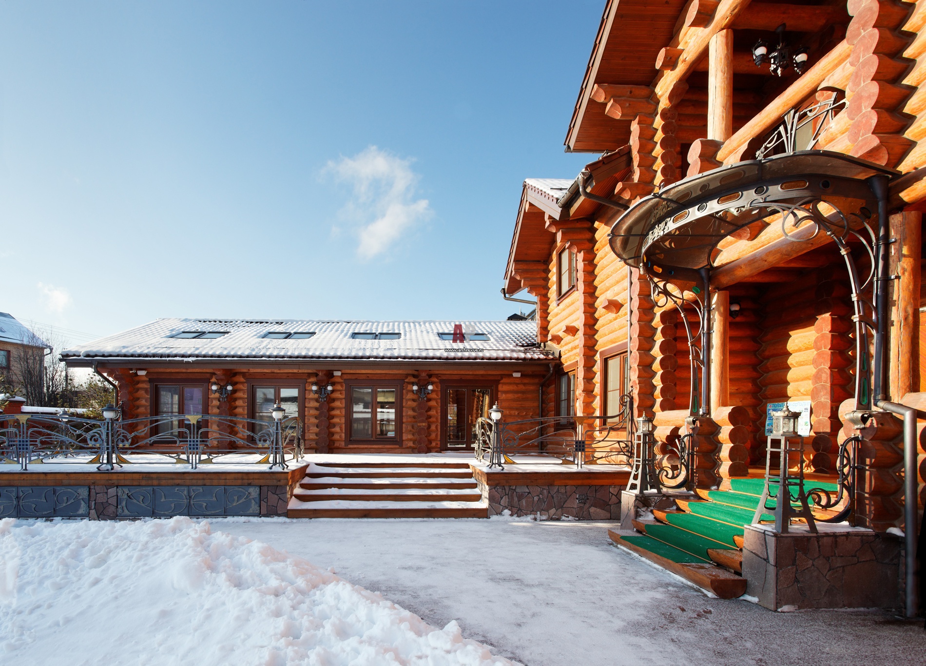 Двухэтажный дом и пристройка бассейна образуют уютный внутренний дворик. Фундамент террасы облицован натуральным камнем. Ограждение террасы, крыльцо, балкон – ковка.