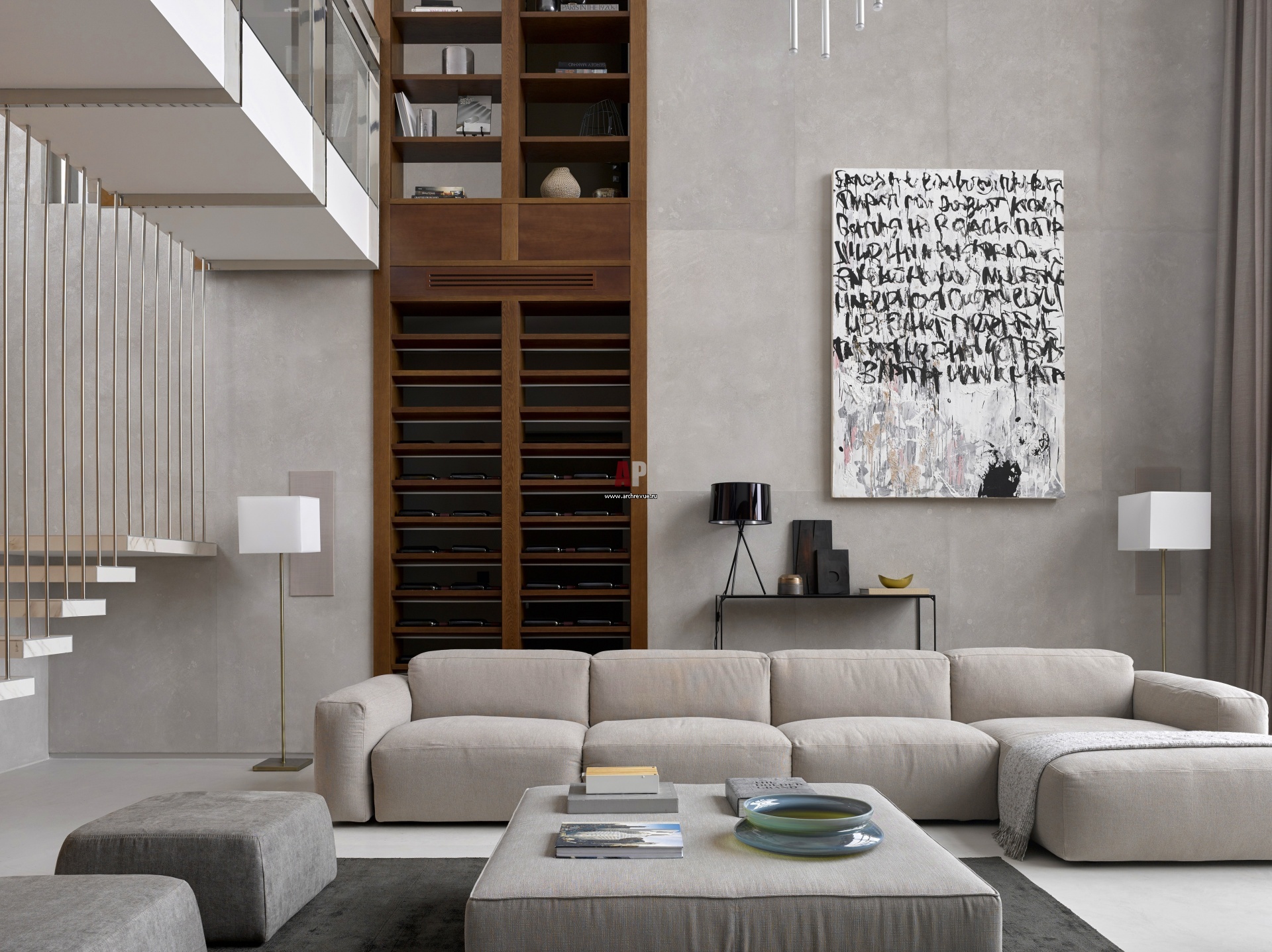 Интерьер гостиной. В поддержку к каменному пиолну был спроектирован оригинальный двухэтажный шкаф с функцией винного бара (внизу) и книжного стеллажа (наверху). Диван и пуфы Nicoline в обивке серым текстилем.