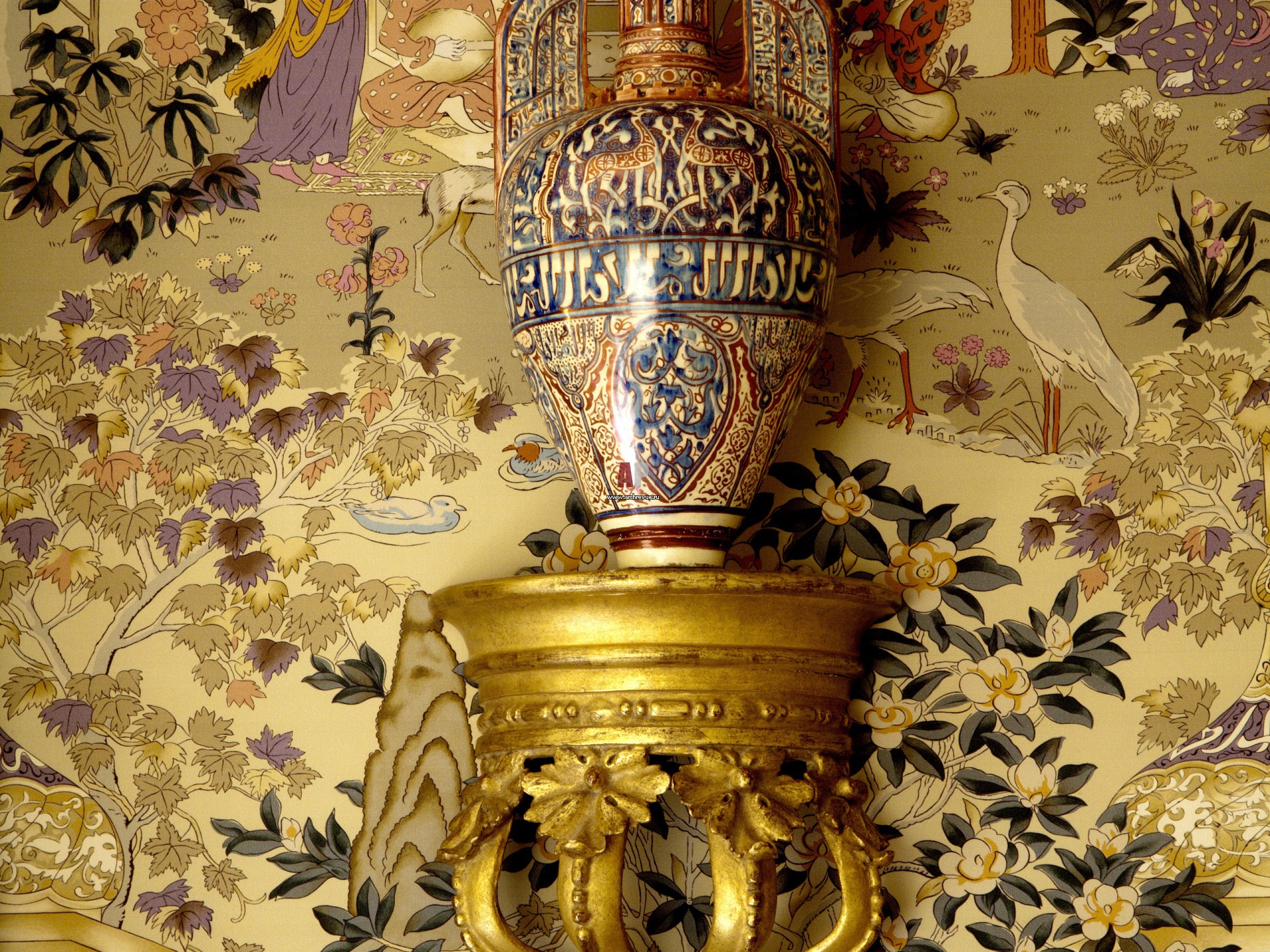 Стены персидской спальни обиты богато орнаментированной тканью. Керамическая ваза XIX века привезена из Турции.
