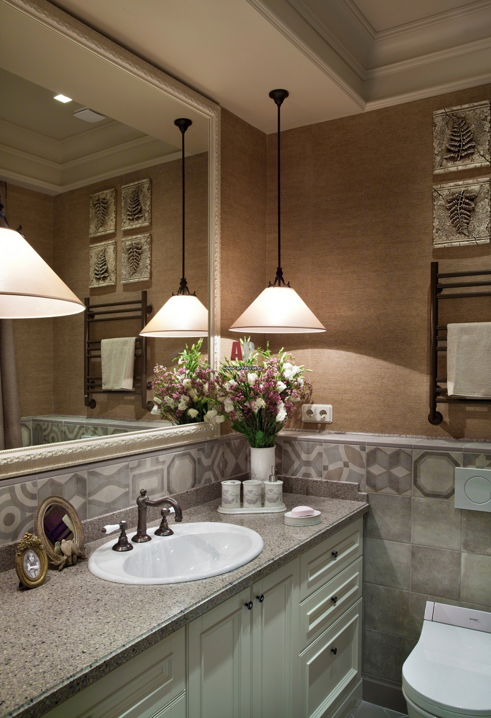 Классическая ванная комната в теплых кофейных тонах. Композиция под раковину, по индивидуальному заказу. Обои, Thibaut. Настенная плитка, Cerim. Потолочный карниз, Orac Decor, поставщик «Ампир Декор». Сантехника раковина, ванна, Villeroy & Boch. Унитаз, Duravit. Смесители и аксессуары, Nicolazzi.