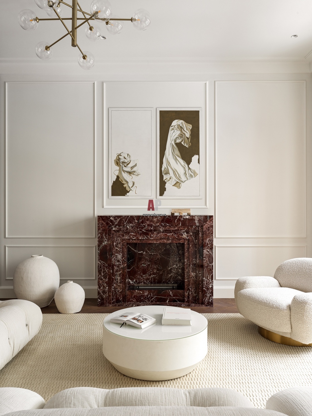 Зона камина. Дизайнер спроектировала красивый мраморный портал с технологичной топкой.