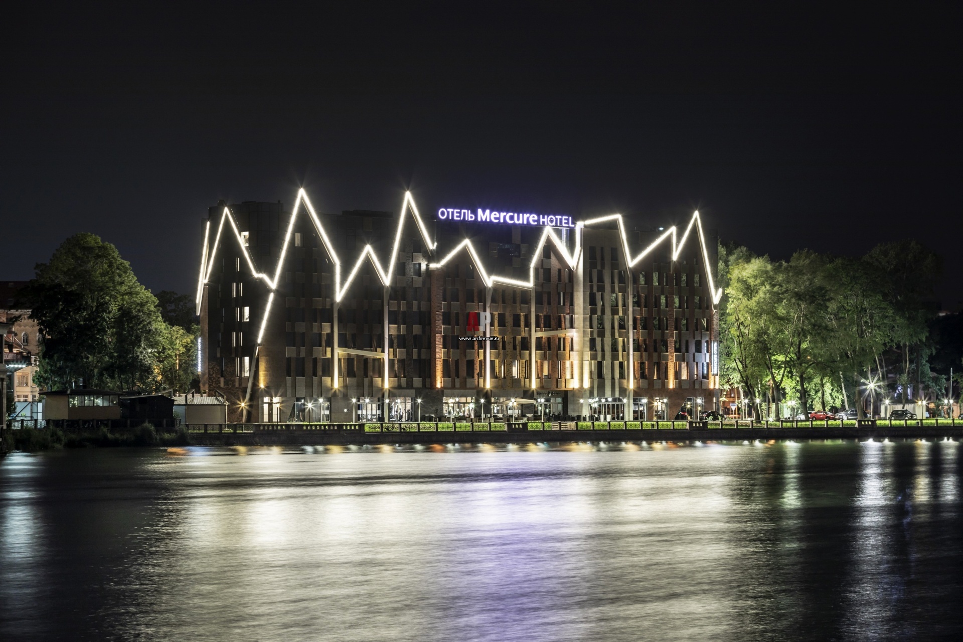 Фасад отеля оформлен светодиодной подсветкой, она имитирует башни, шпили и остроконечные крыши старого города и придает современному кирпичному зданию вид средневековой постройки.