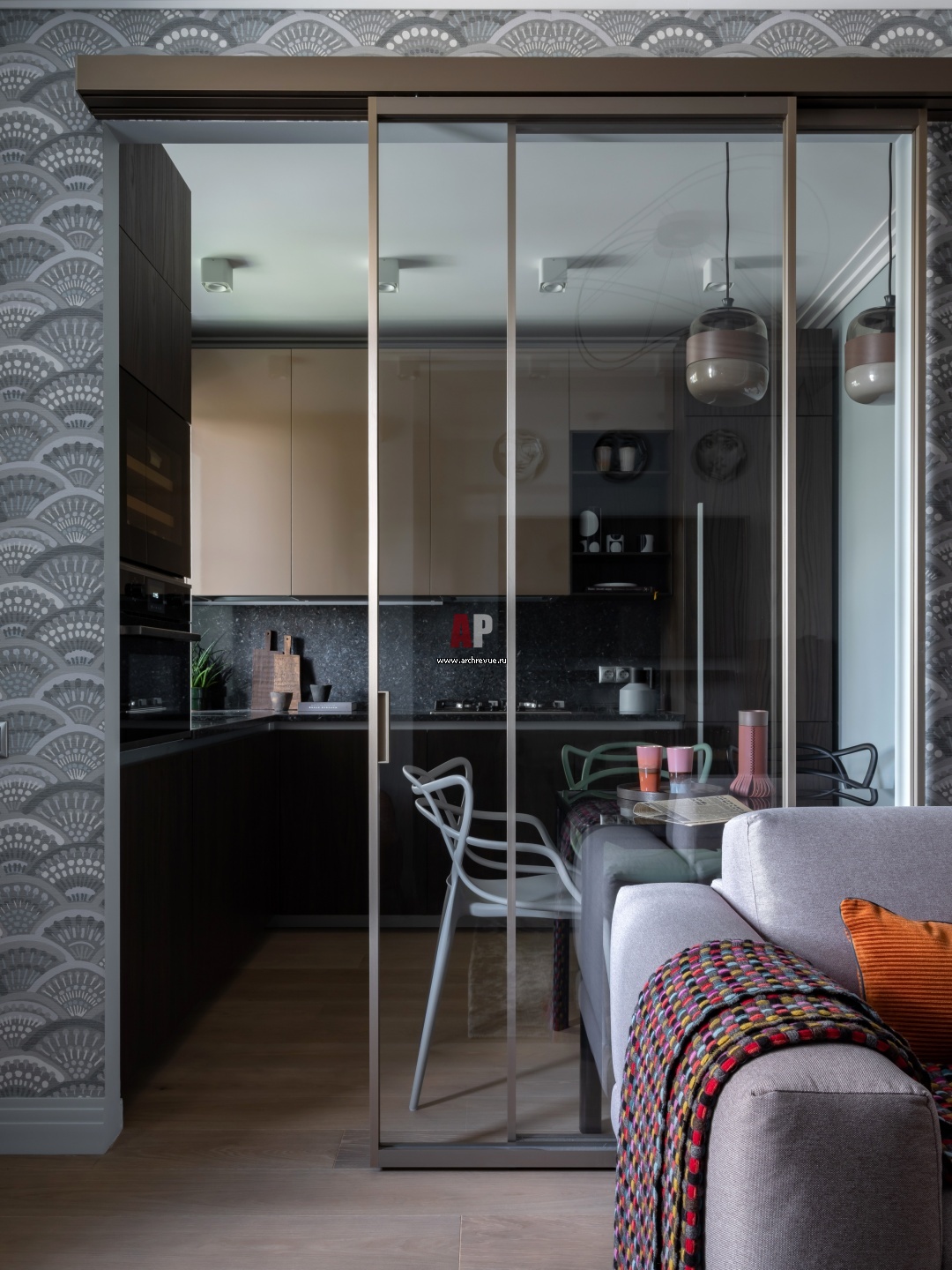 Между кухней и гостиной установлена раздвижная стеклянная перегородка, ADL. Кухня, Ernestomeda. Стол и стулья, Kartell. Светильники, Vistosi.
