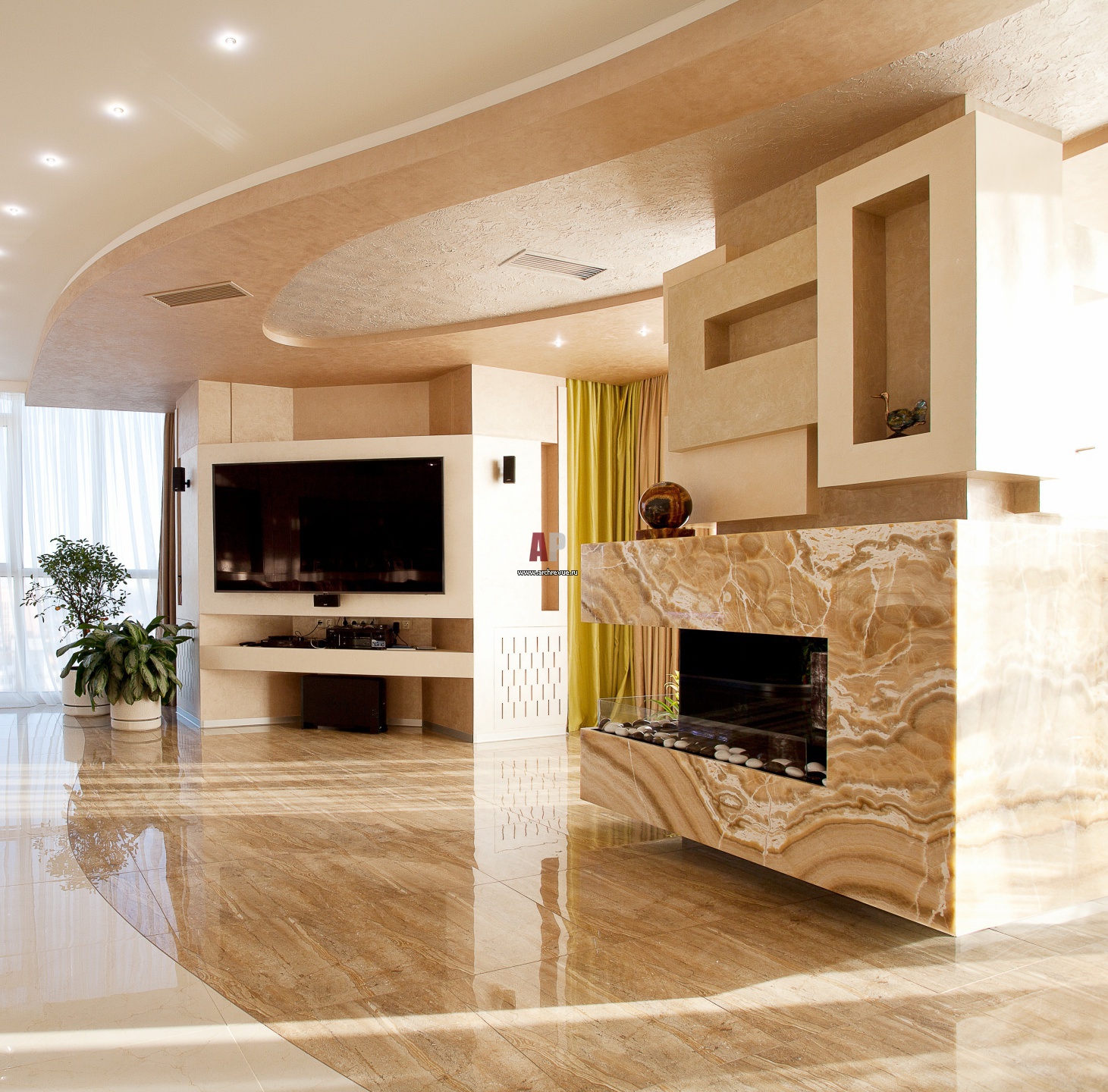 Потолок в гостиной выполнен в двух уровнях – заниженная часть отделяет каминную и столовую зоны от основной. Помимо стен, декоративная штукатурка нанесена на заниженную часть потолка, а в углубление добавлена поталь.
