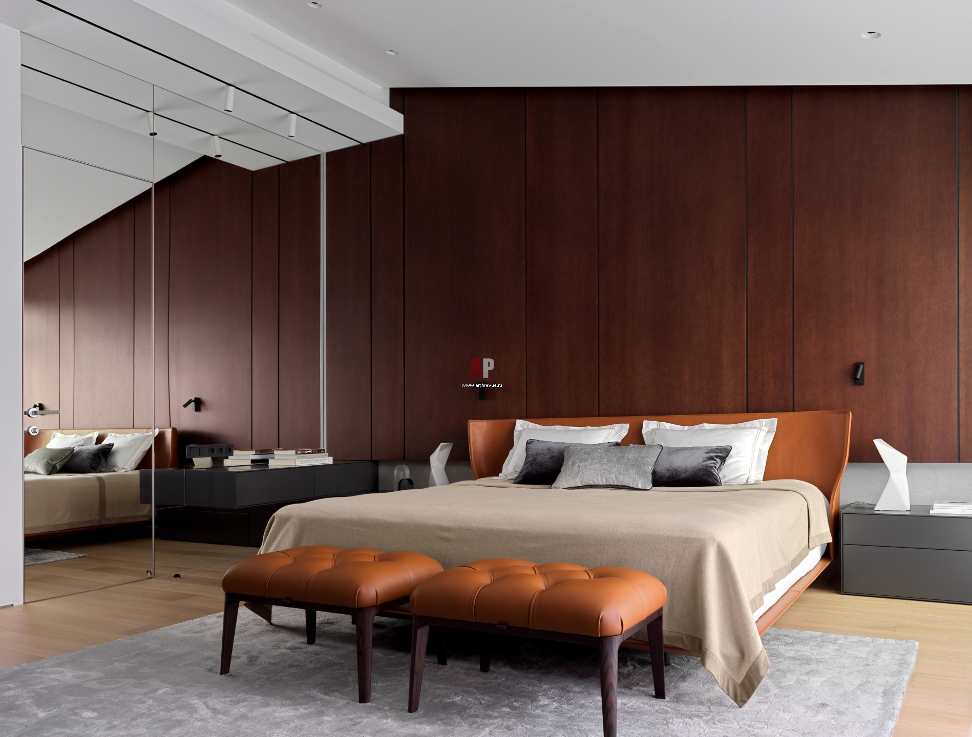 Мансардная квартира на Полянке. Хозяйская спальня. Кровать с красивым изогнутым изголовьем из рыжей кожи сделана на заказ. Кожаные банкетки, Poltrona Frau.