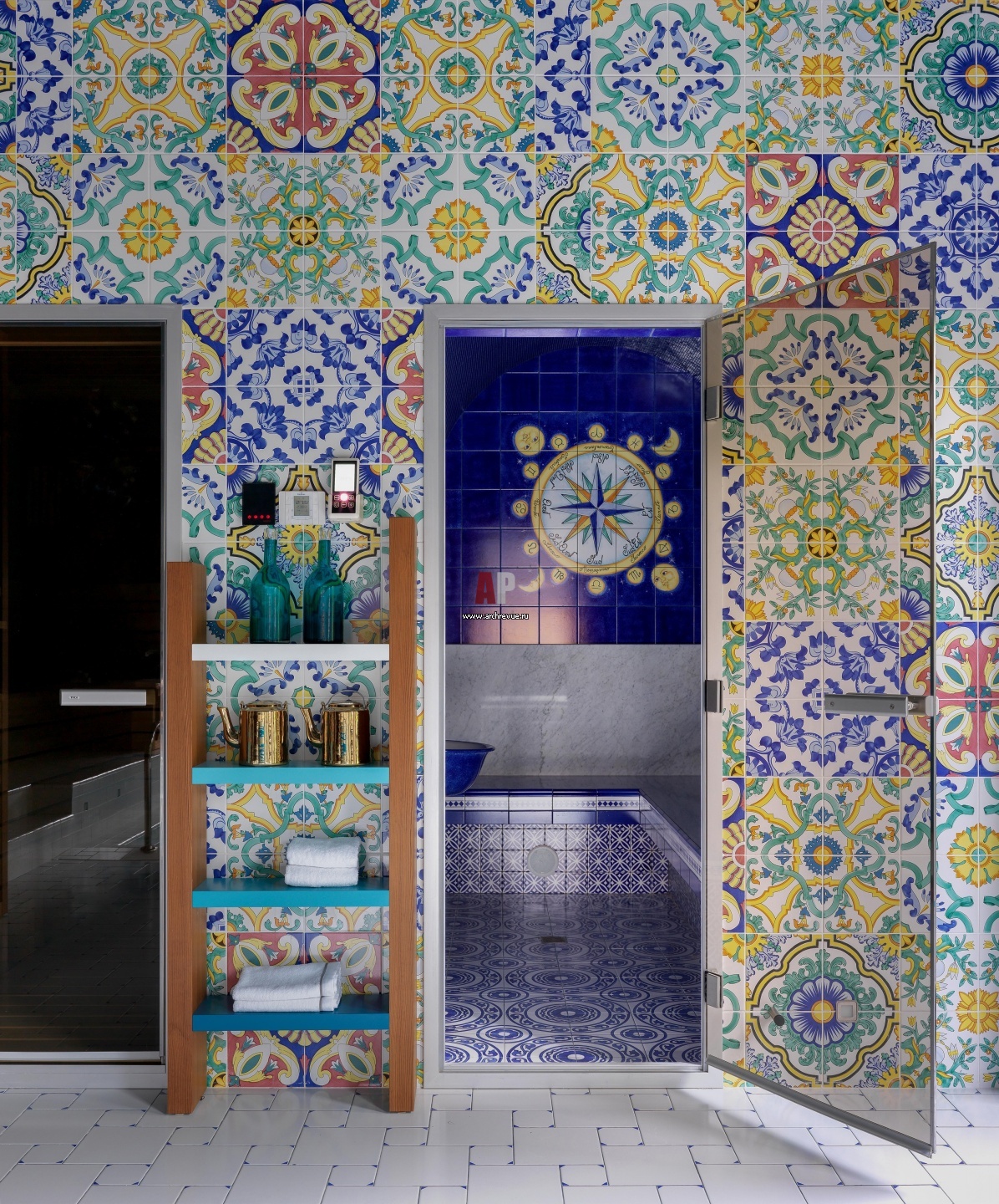 Зона сауны снаружи внутри оформлена керамической плиткой со средиземноморским орнаментом, она произведена под проект в южной части Италии.