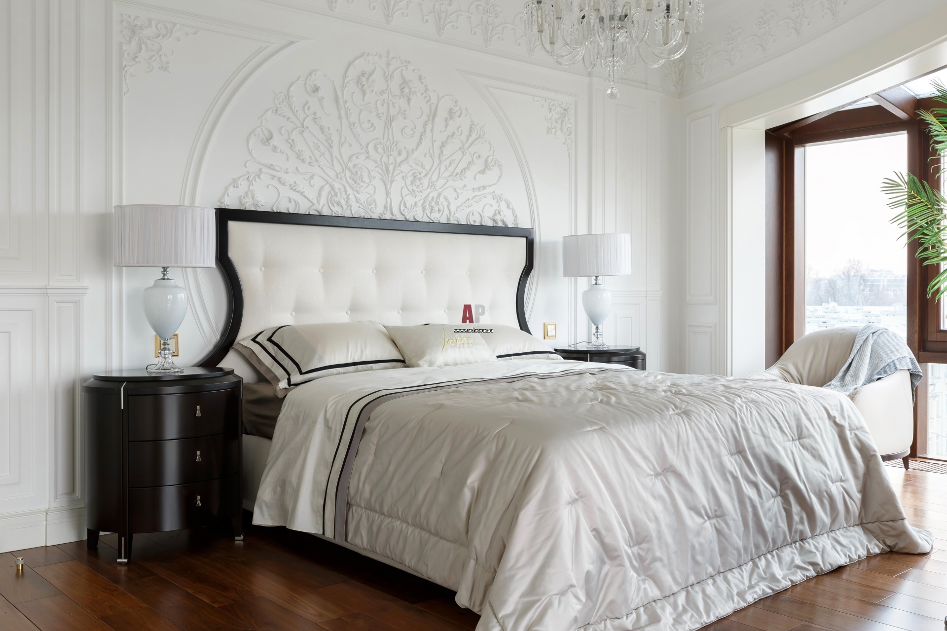 Главное украшение хозяйской спальни – двухметровая лепная розетка, окантованная лепными молдингами. Все лепные изделия их гипса были сделаны на заказ мастерами из Санкт-Петербурга. Кровать, прикроватные тумбочки, кресла, Selva.
