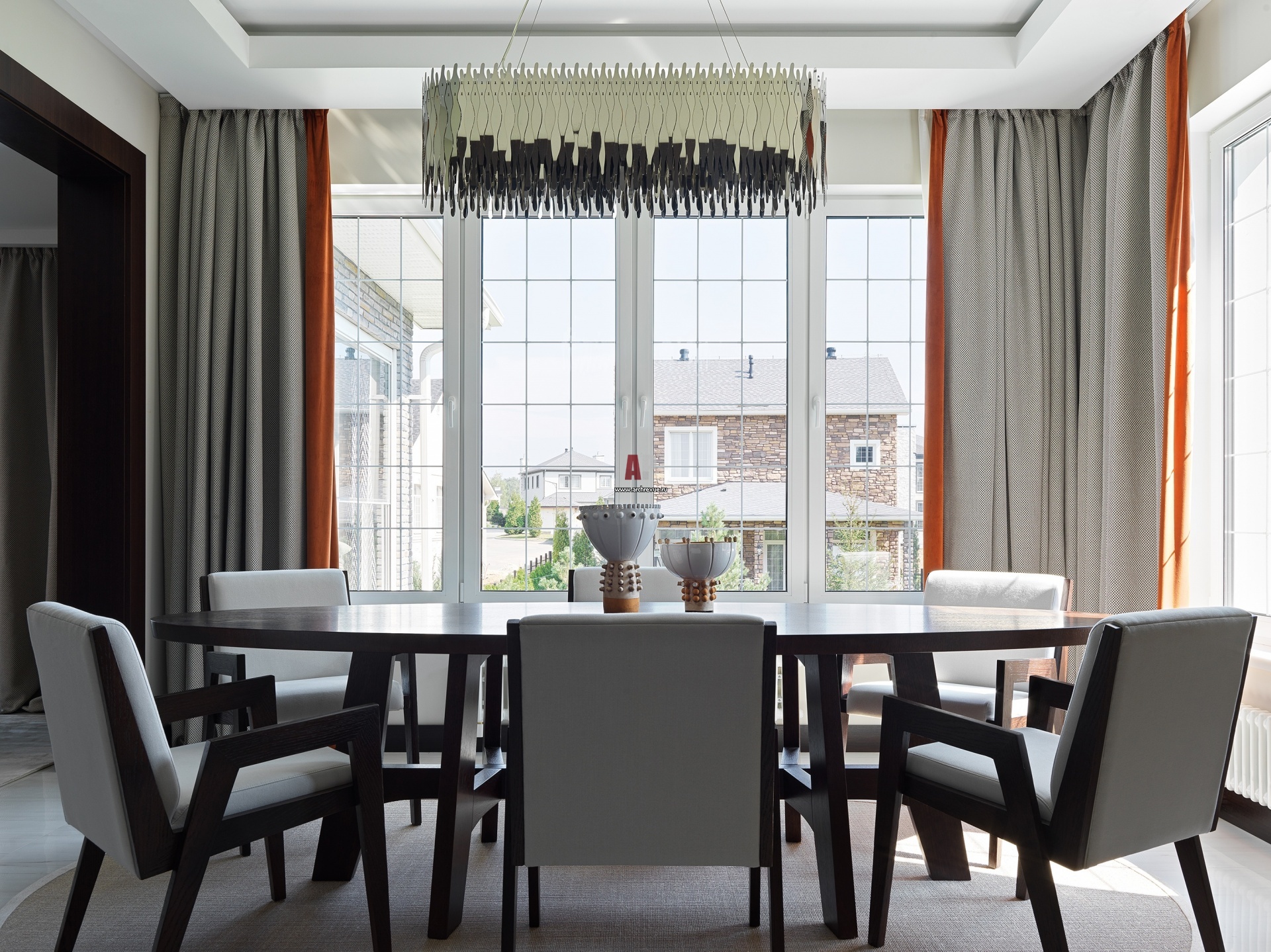 Столовая у окна, она полна светом и выглядит торжественно. Обеденный стол выполнен на заказ по эскизам дизайнера, Bollu. Столешница в форме яйца рифмуется с ковром из сизаля. Стулья сделаны по эскизам.