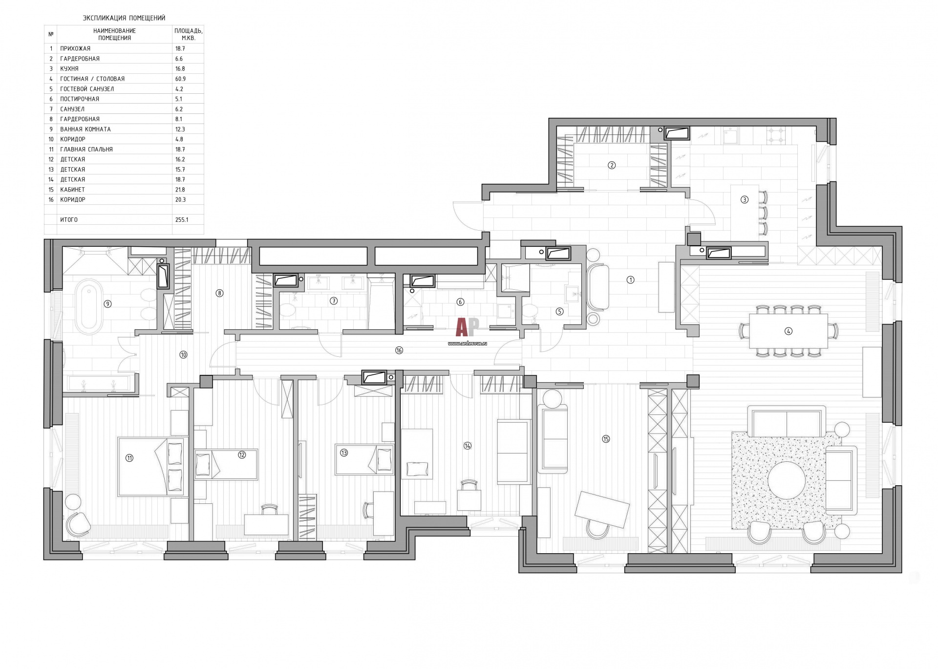Планировка большой семейной квартиры на берегу Невы. Общая площадь – 225 кв. м.