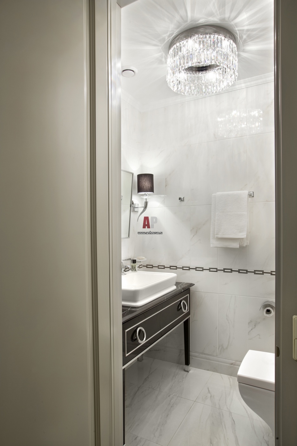 Вид на гостевой санузел. Стены, пол, светлый керамогранит с черными прожилками. Сантехника, Villeroy & Boch, Keramag.