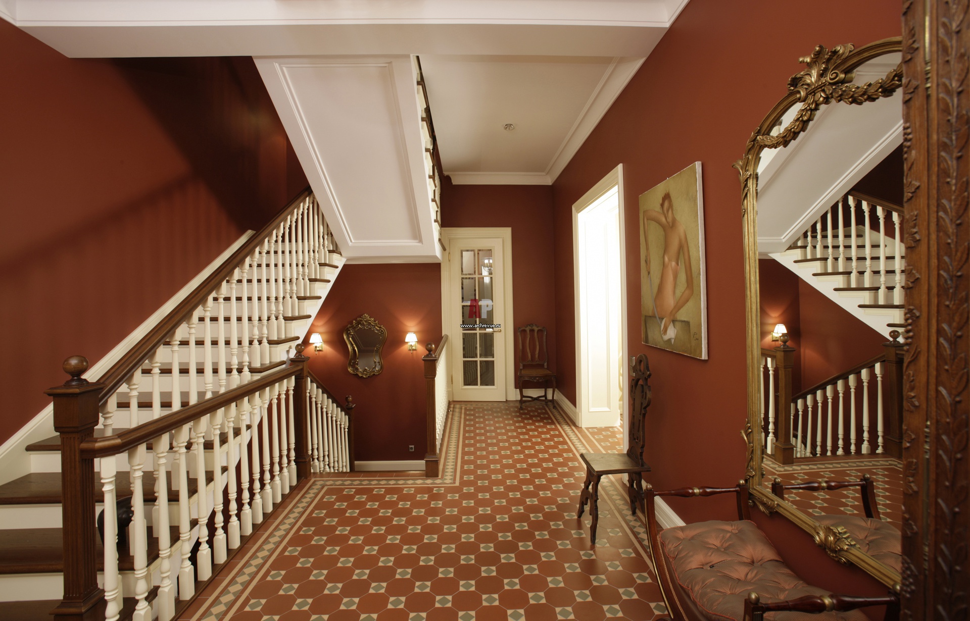 Интерьер лестничного холла в английском стиле. Полы выстланы метлахской плиткой, поставщик «Интерьерный салон» («Биг Бен»). Картина петербургского художника Николая Резниченко.