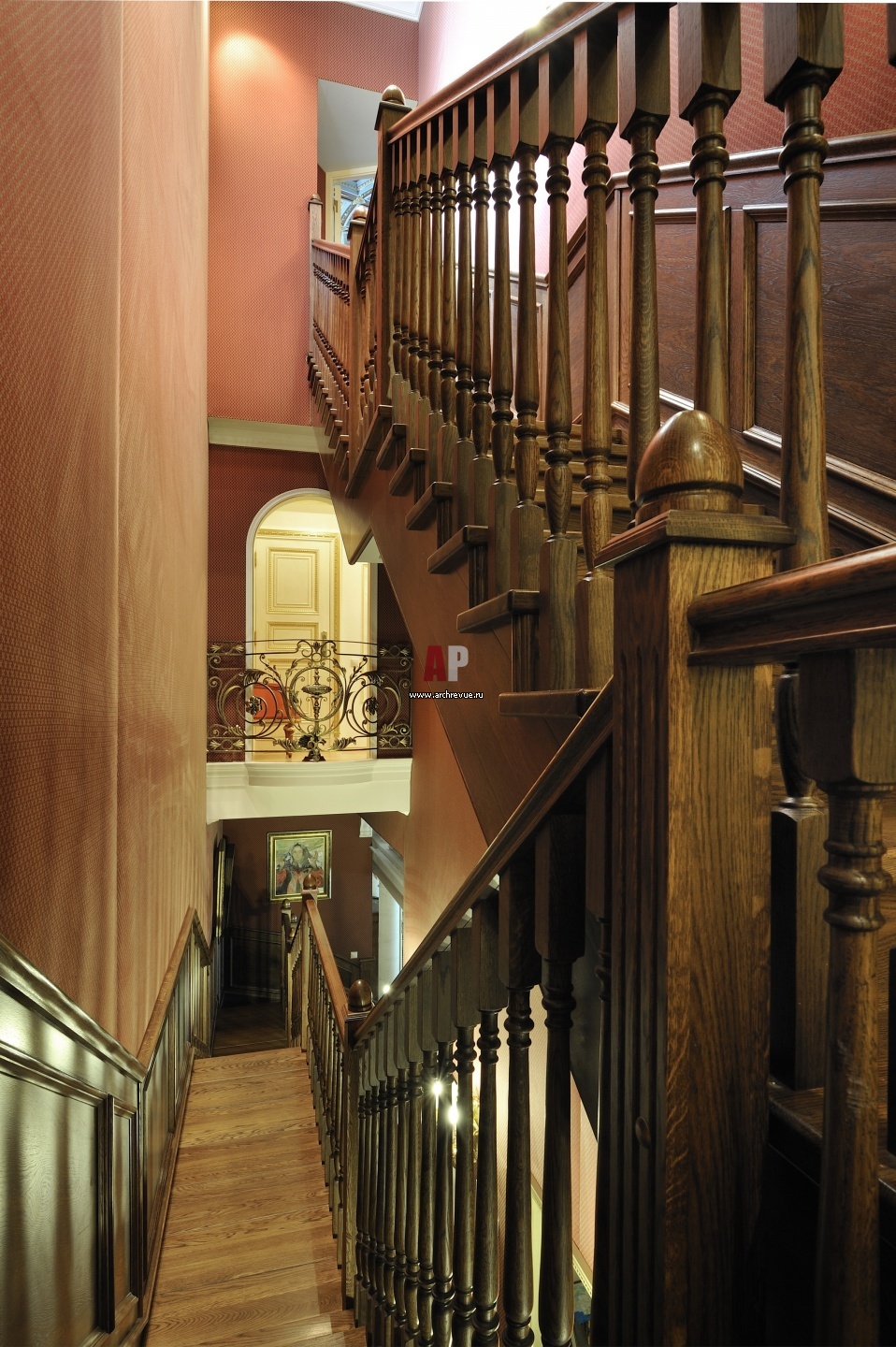 Деревянная лестница в мансардный этаж. Кроме лестниц в доме спроектирован лифт, машинное отделение лифта располагается выше круглого зала, на шестом уровне дома.