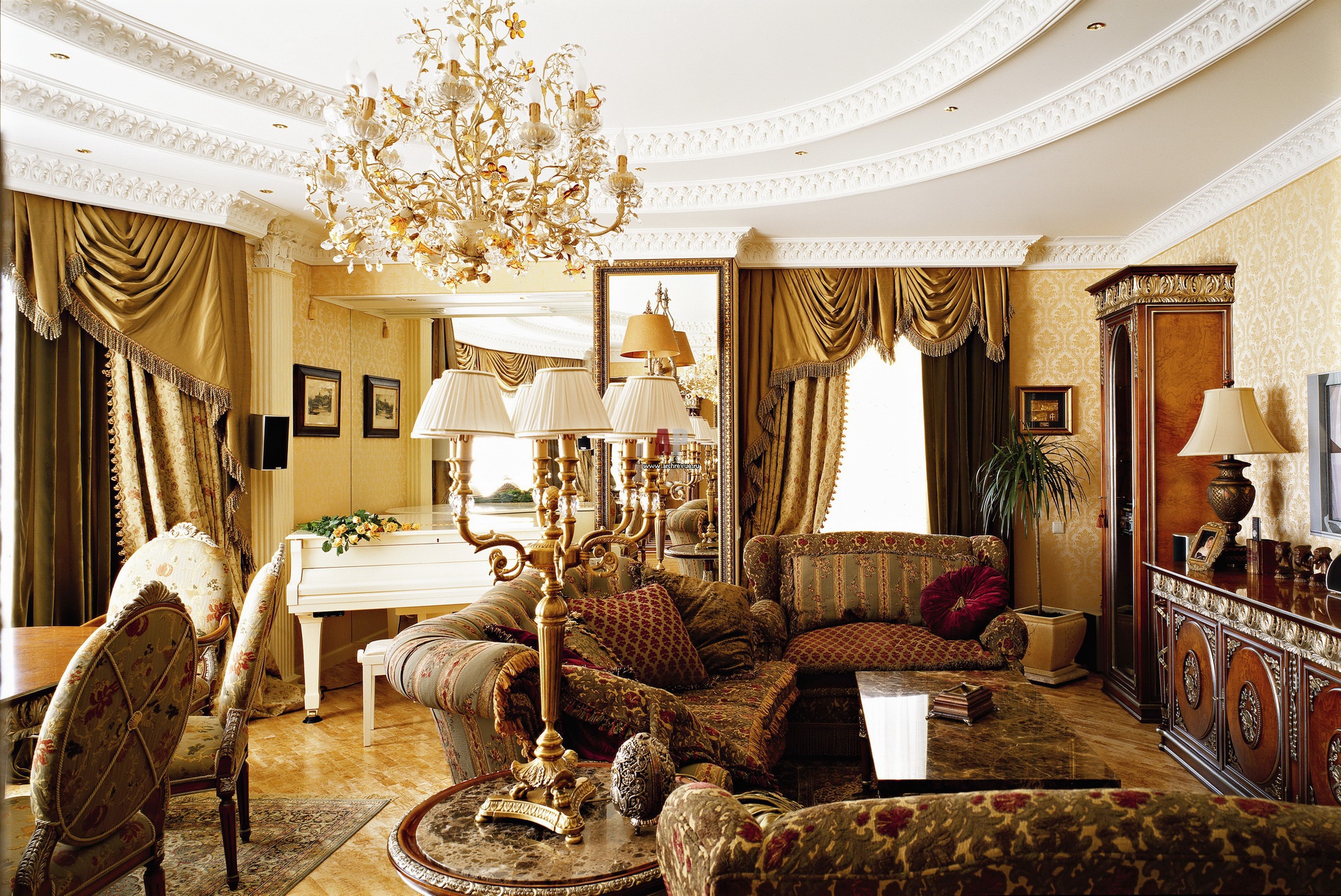 На полу гостиной – паркет из карельской березы, поставщик Visst-A. Рояль цвета слоновой кости поставили сами хозяева.