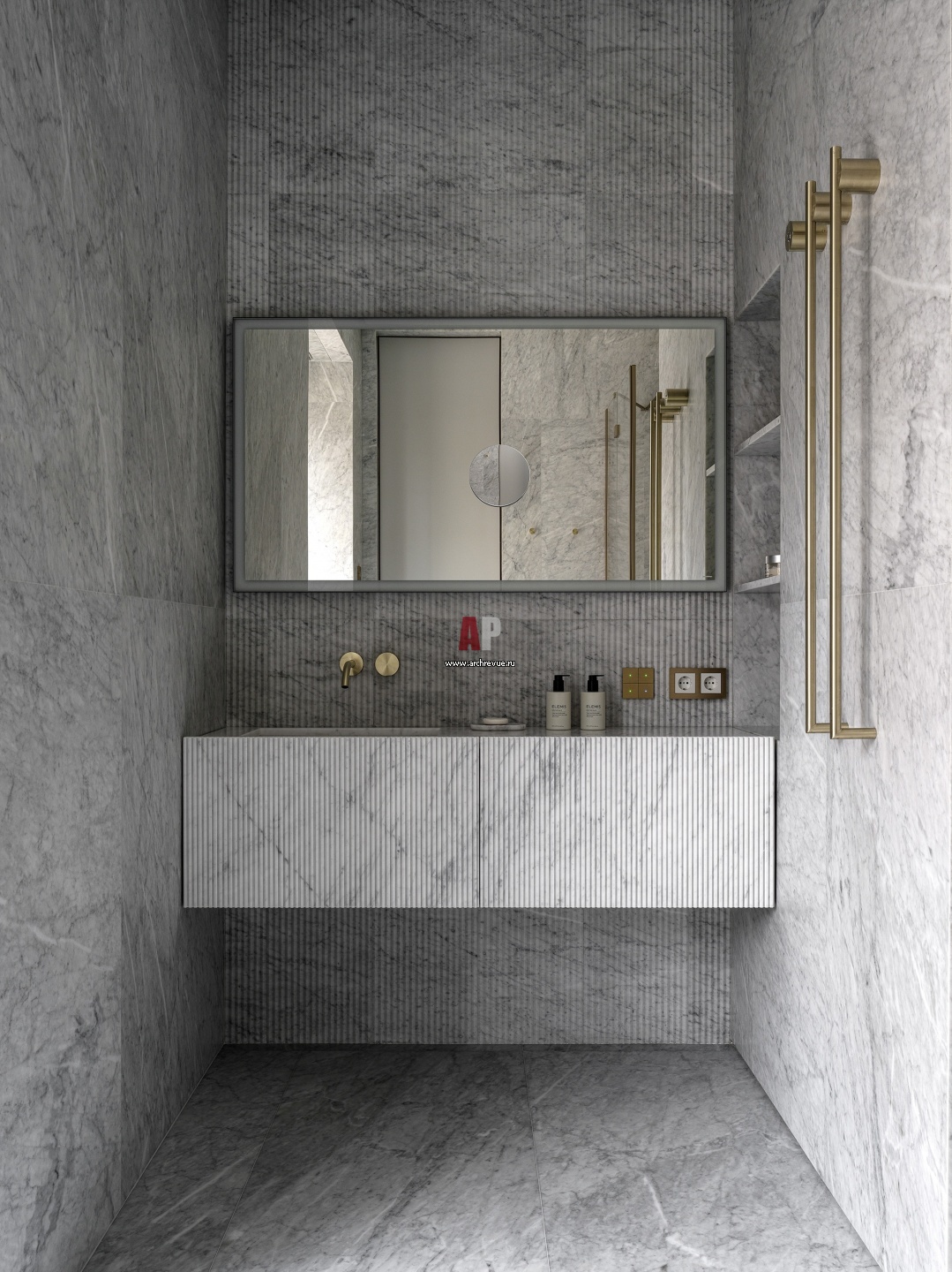 Хозяйская ванная комната. Раковина из камня, Salvatori. Смесители, полотенцесушитель, Cea. Зеркало, Antonio Lupi.