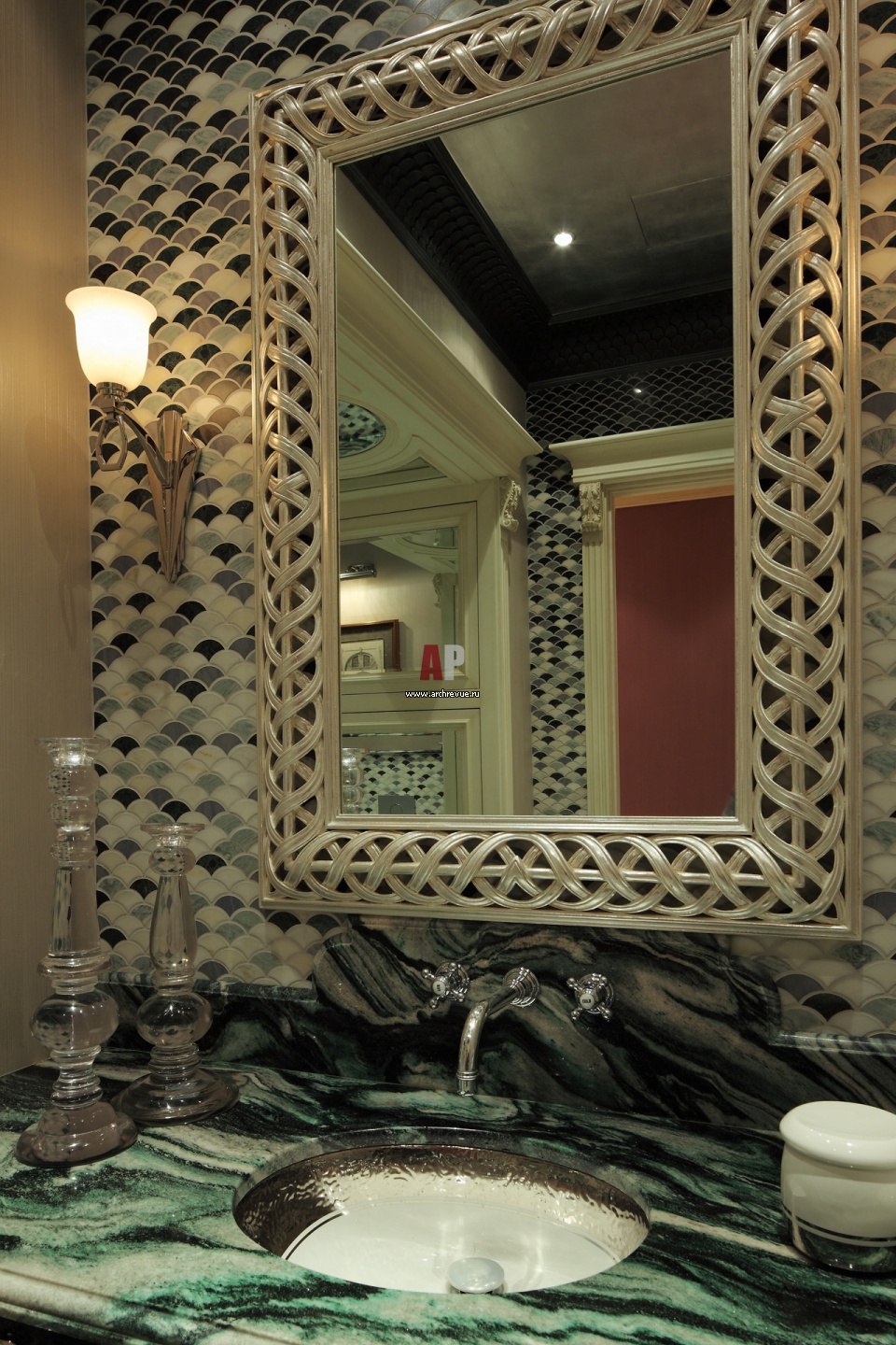 Френмент оформления гостевого санузла. Панно с мотивом рыбьей чешуи, бра в виде цветка ландыша.