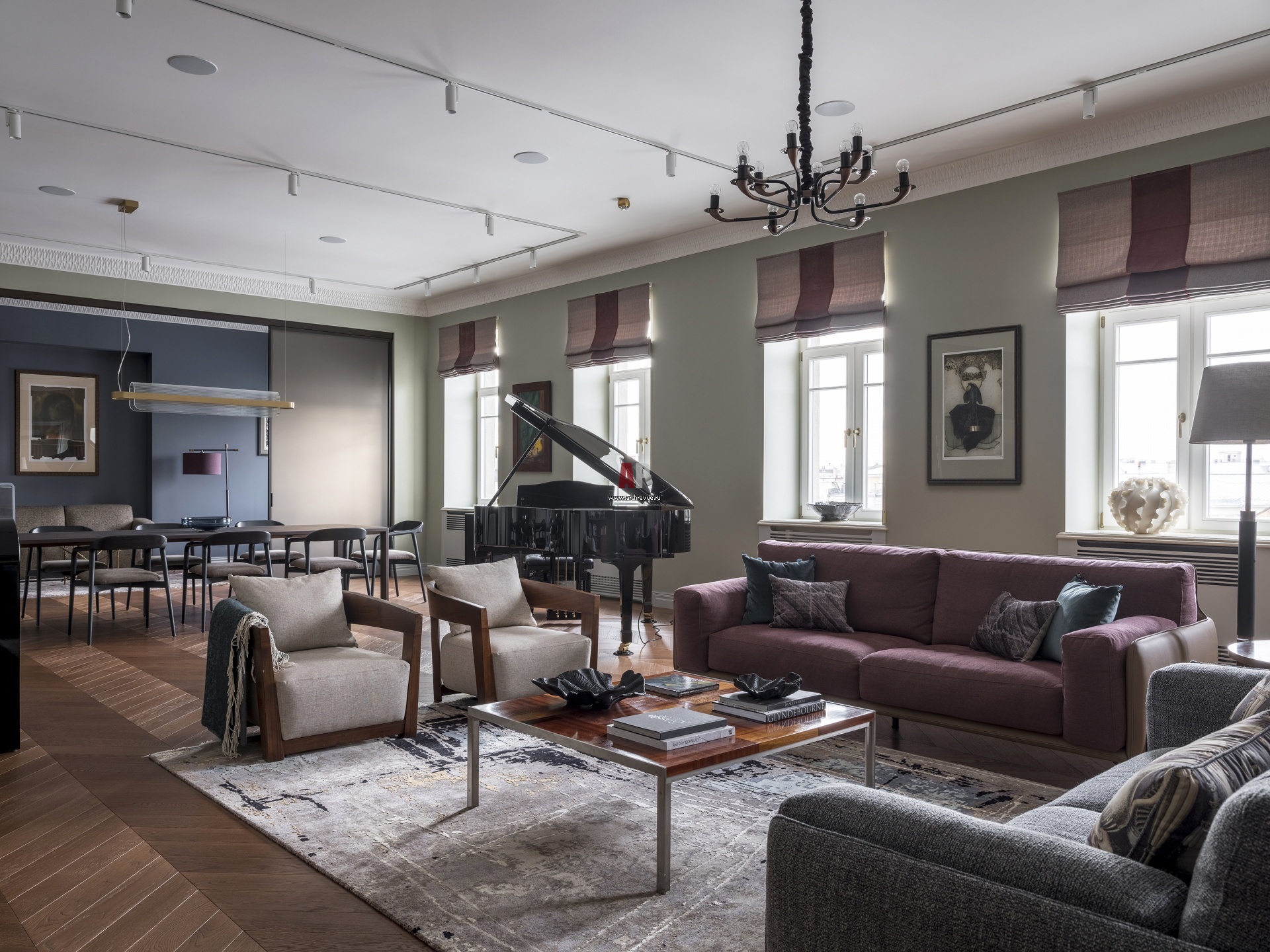 Парадная гостиная-салон занимает более половины квартиры. На полу – итальянский дубовый паркет Garbelotto, уложенный французской елкой. Стены выкрашены краской оливкового оттенка.