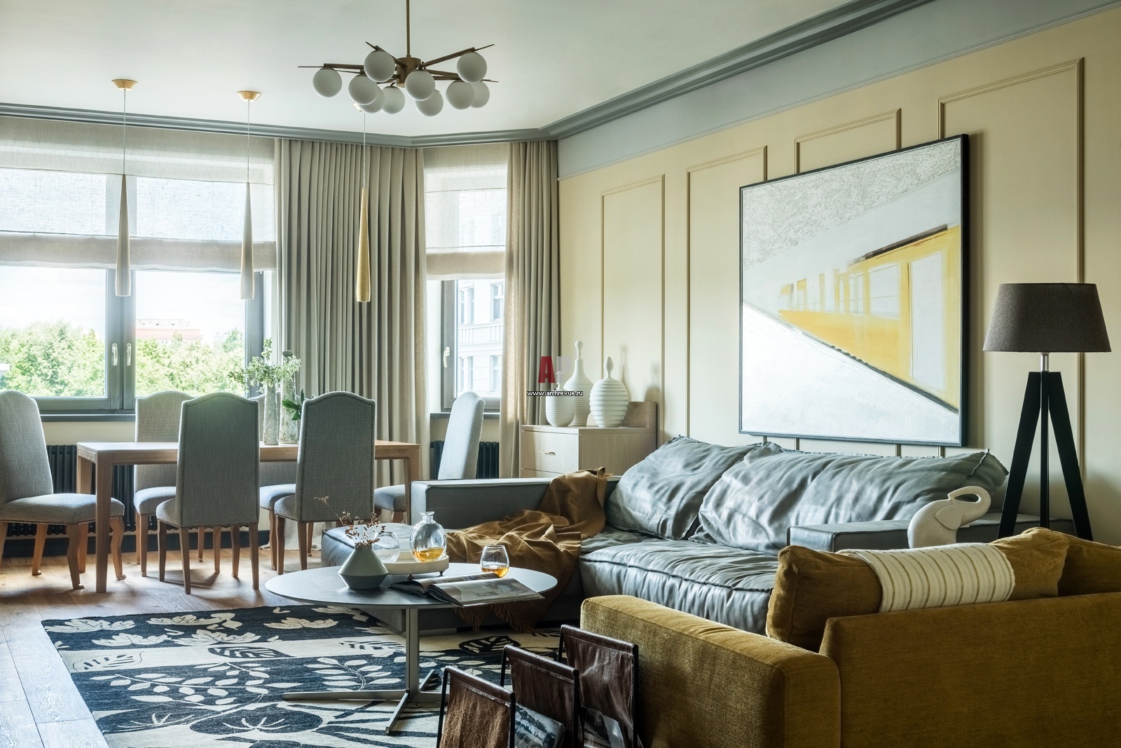 Общая гостиная с обеденной группой возле окна. Стол, The Idea. Стулья, на заказ.