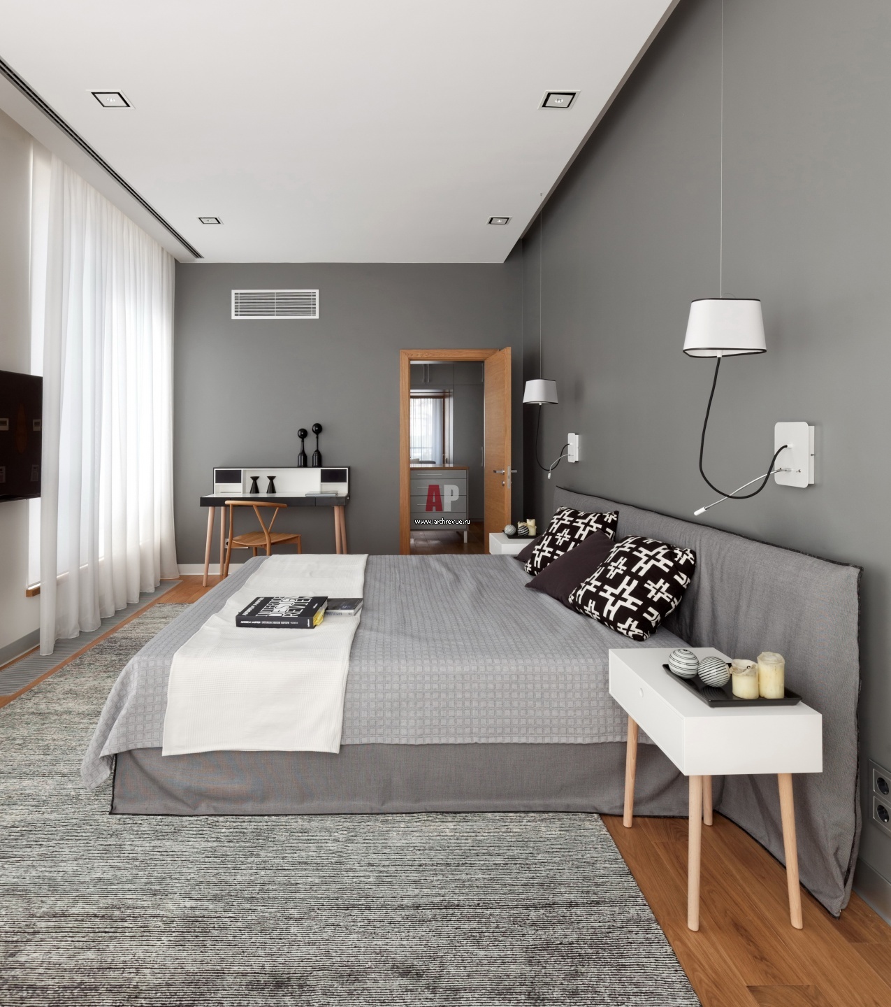 Интерьер спальни квартиры в стиле 1970-х годов выполнен в серой цветовой гамме. Кровать с изголовьем, обитым льном, Gervasoni. Тумбочка с радио, прикроватные столики в стиле ретро, Miniforms.