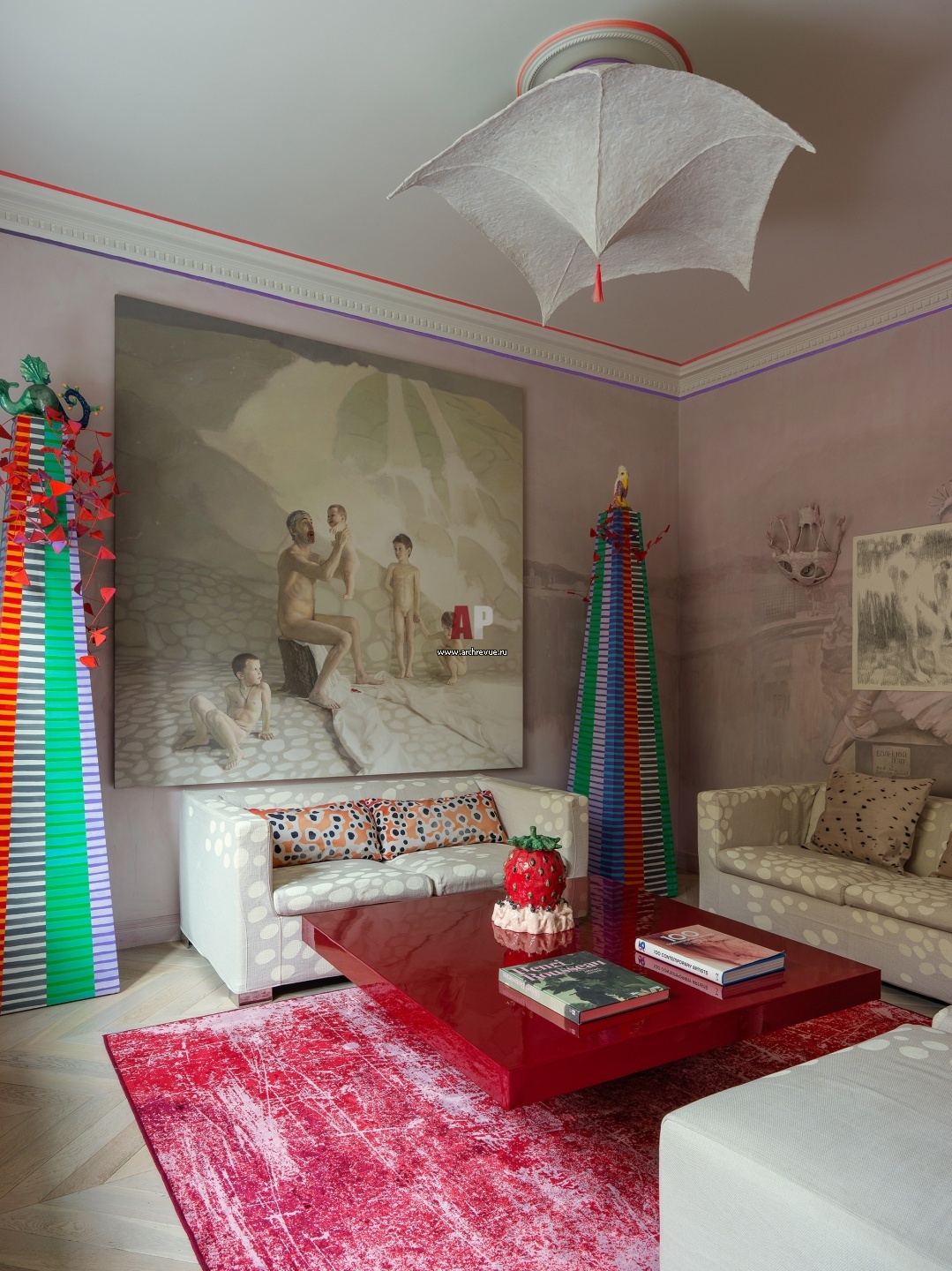 Малая гостиная. Ранее здесь находилась детская сыновей. Роспись на стенах сохранилась, но дополнилась произведениями современного искусства. За диваном Minotti картина Татьяны Антошиной «Кронос, поедающий своих детей». Светильник сделан на заказ.