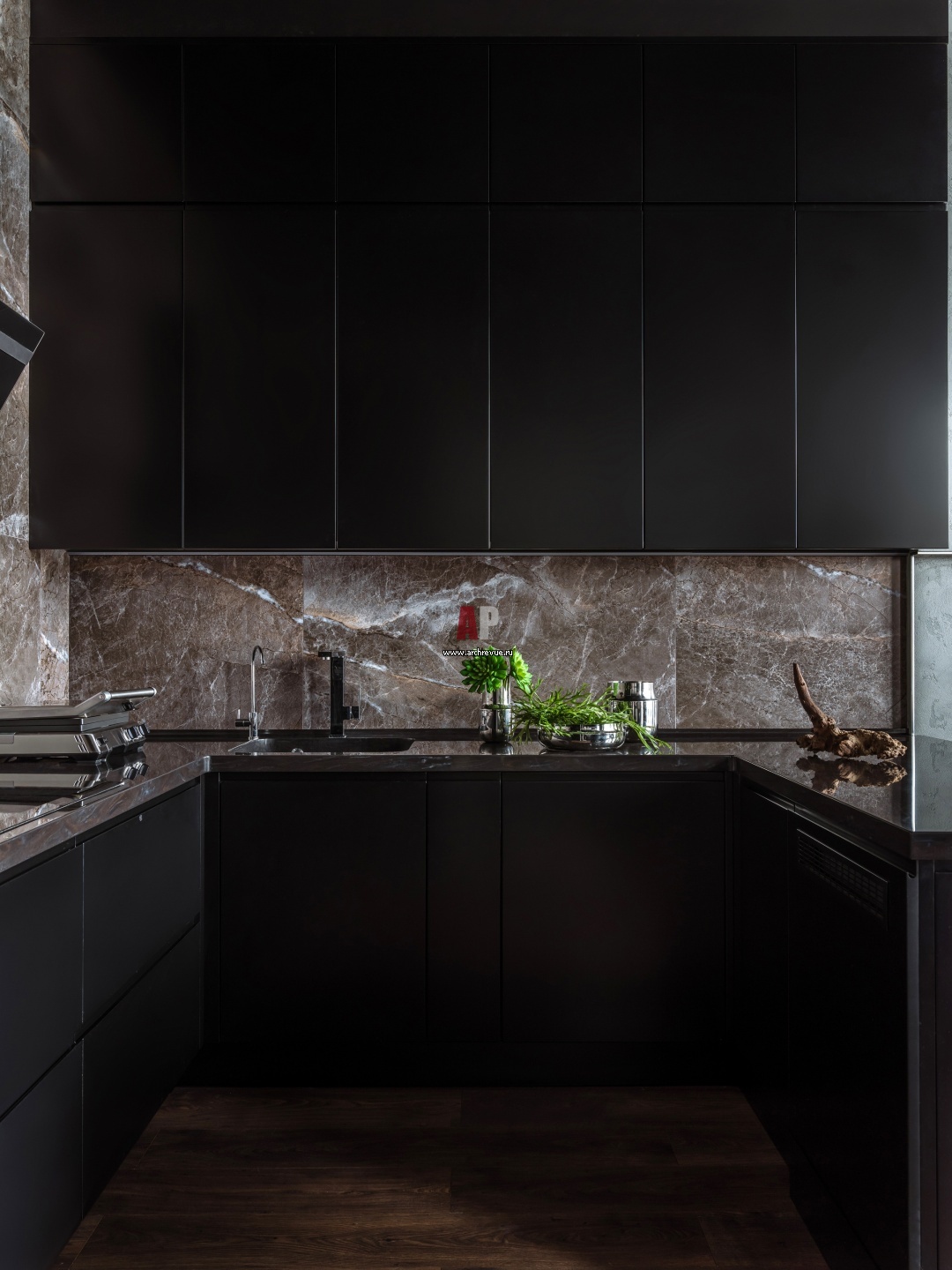 Фасады мебели выполнены в однотонной матовой отделке: навесные кухонные шкафы с вертикальным ритмом доходят до выкрашенного в черный цвет потолка. Фартук выложен крупноформатным кераморганитом под мрамор, Santemax, коллекция Alanya Antracite.