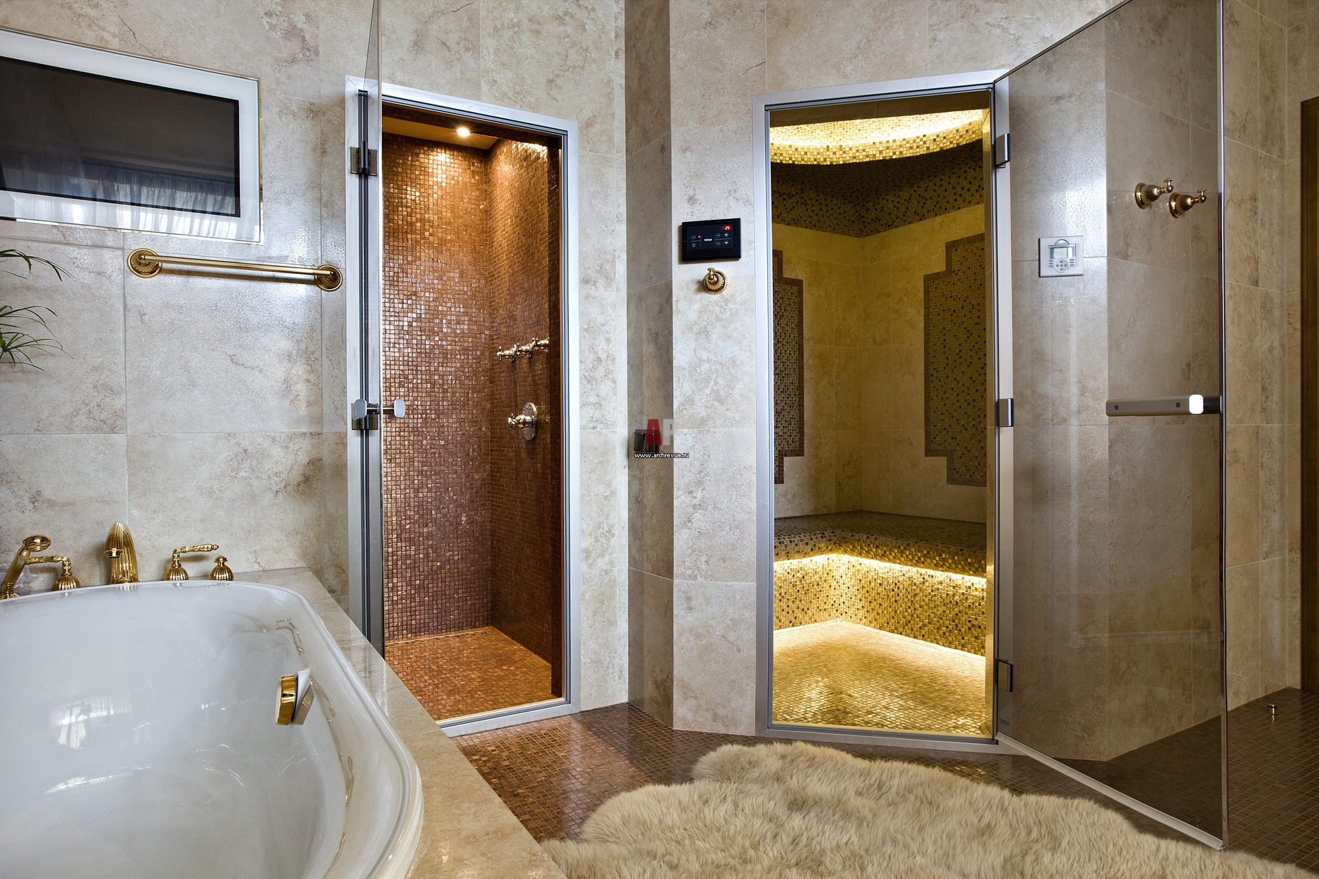 Интерьер хозяйской ванной комнатой с душевой и хаммамом. Сантехника, Villeroy & Boch.