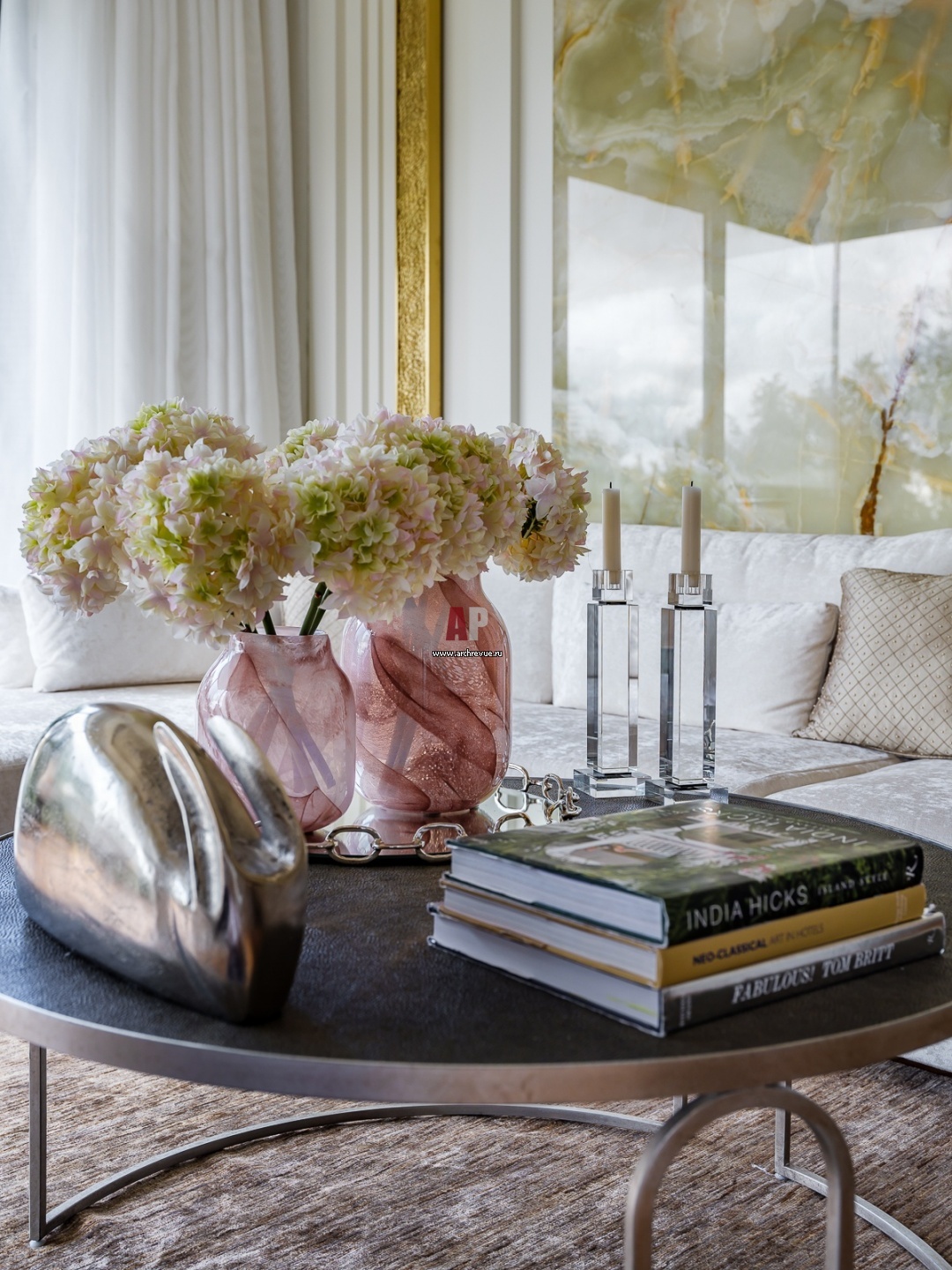 Современная светлая квартира с элементами ар-деко. Столик, Eichholtz. Декор, поставщик Charles.Cameron.