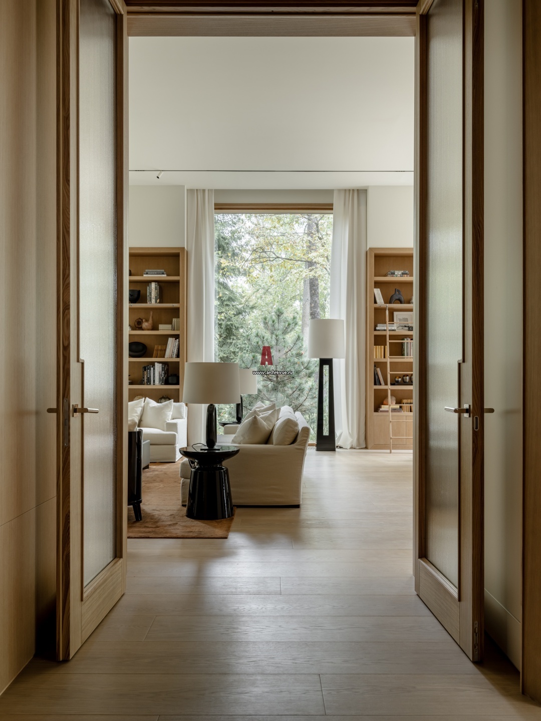 Интерьер дома балансирует на грани лаконичности и мягкости. Вид из холла на гостиную.