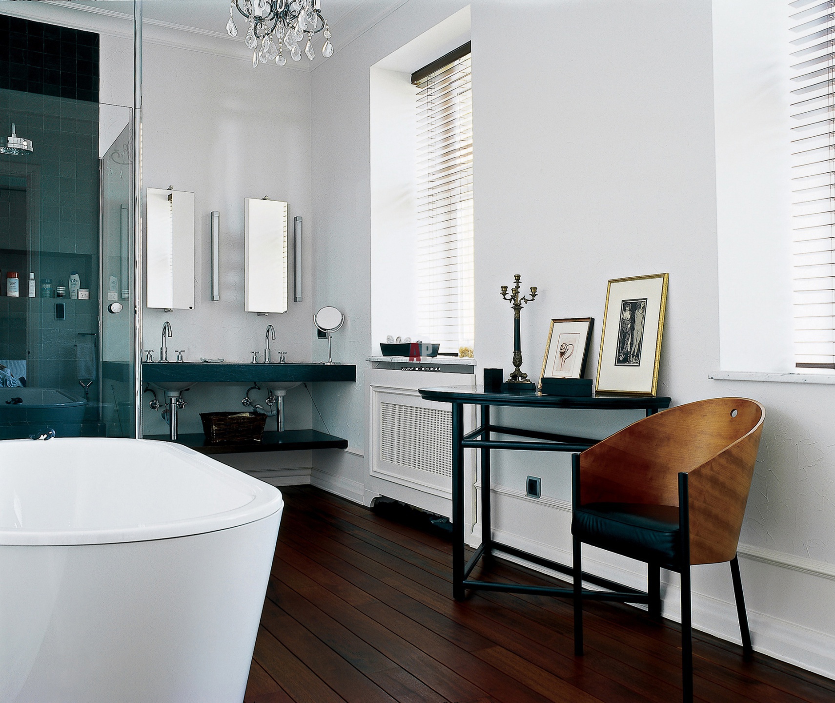 Черно-белый интерьер ванной комнаты площадью 13,5 кв. м. Отдельностоящая ванна, Duravit. Душевая кабина из стекла, Hueppe. Стена в душе и консоль умывальника выполнены из сланца цвета асфальта.