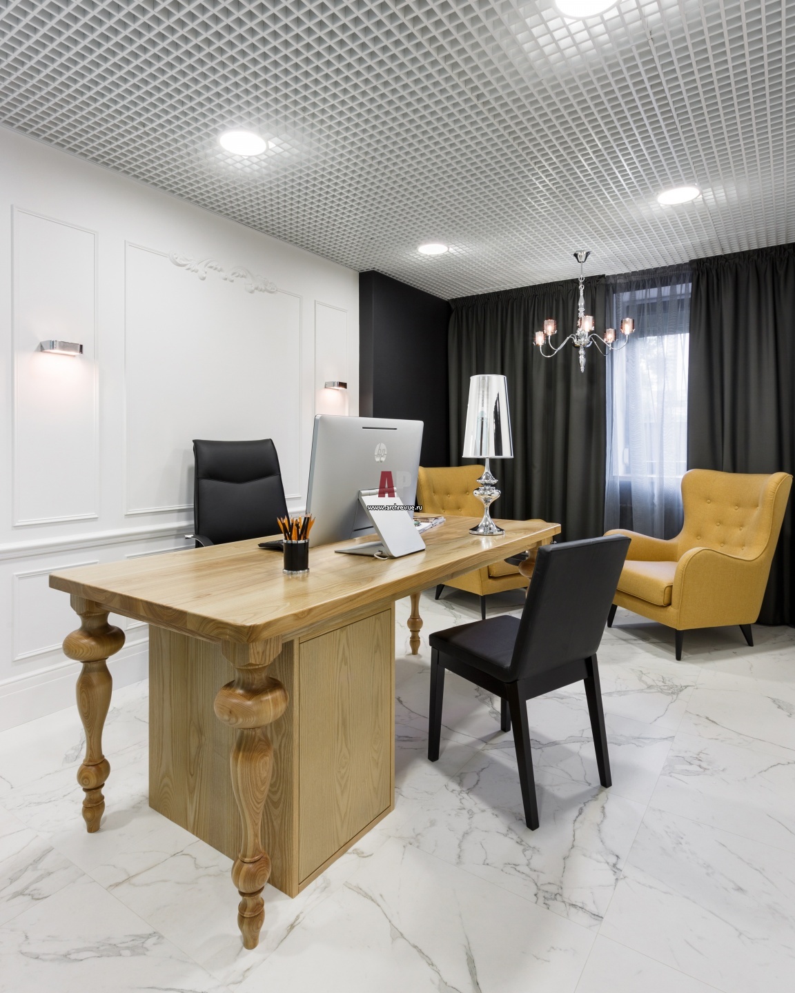 В кабинете адвоката есть зона для комфортного общения с клиентами. Она выделена черным цветом у окна. В декоре окон использован темный тюль и черные портьеры. Классические кресла из светло-медовой кожи. Рабочий стол из светлого дерева сделан на заказ.