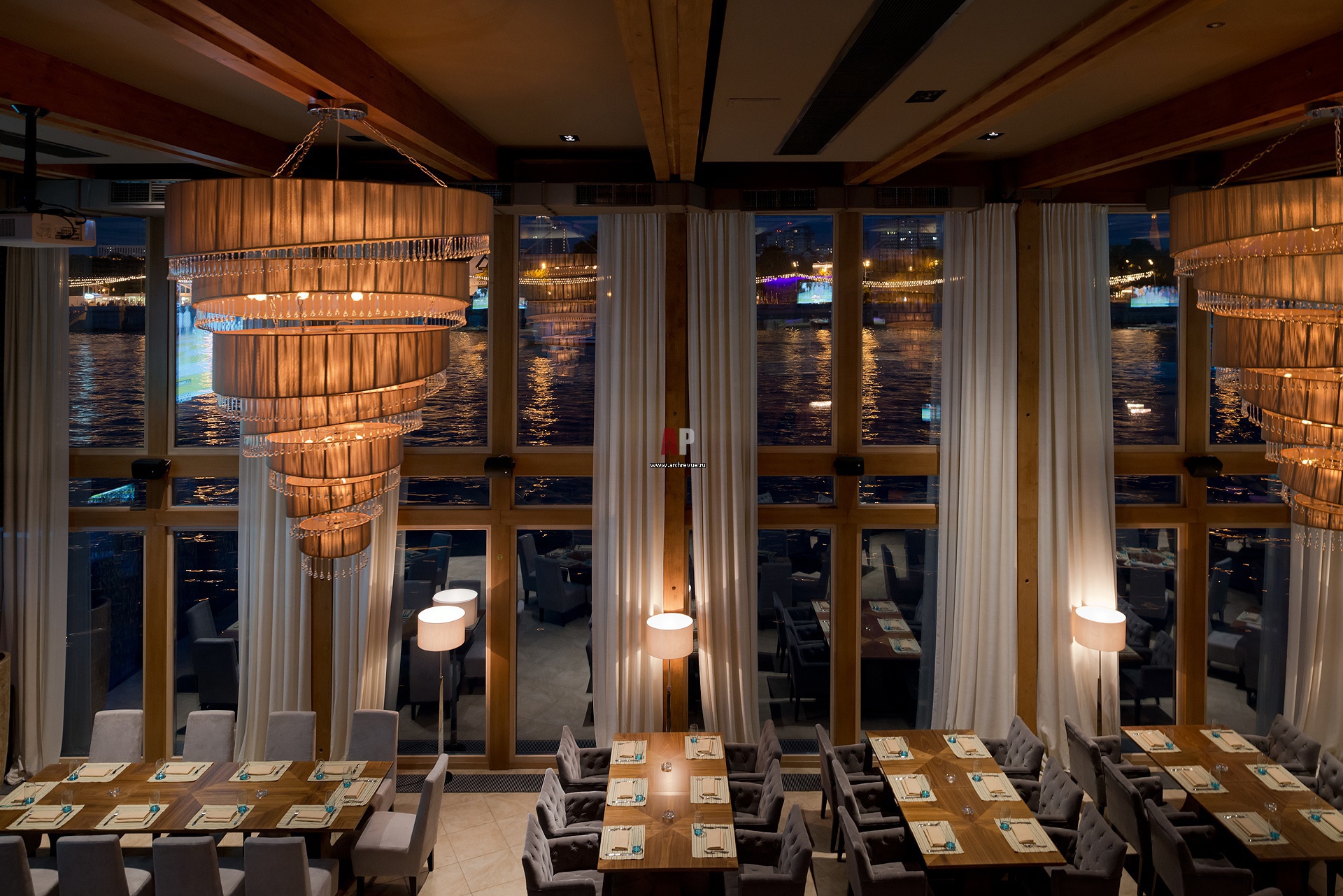 Интерьер основного зала ресторана. Важную роль в интерьере играет световое оформление: декоративное освещение и неоновая подсветка.