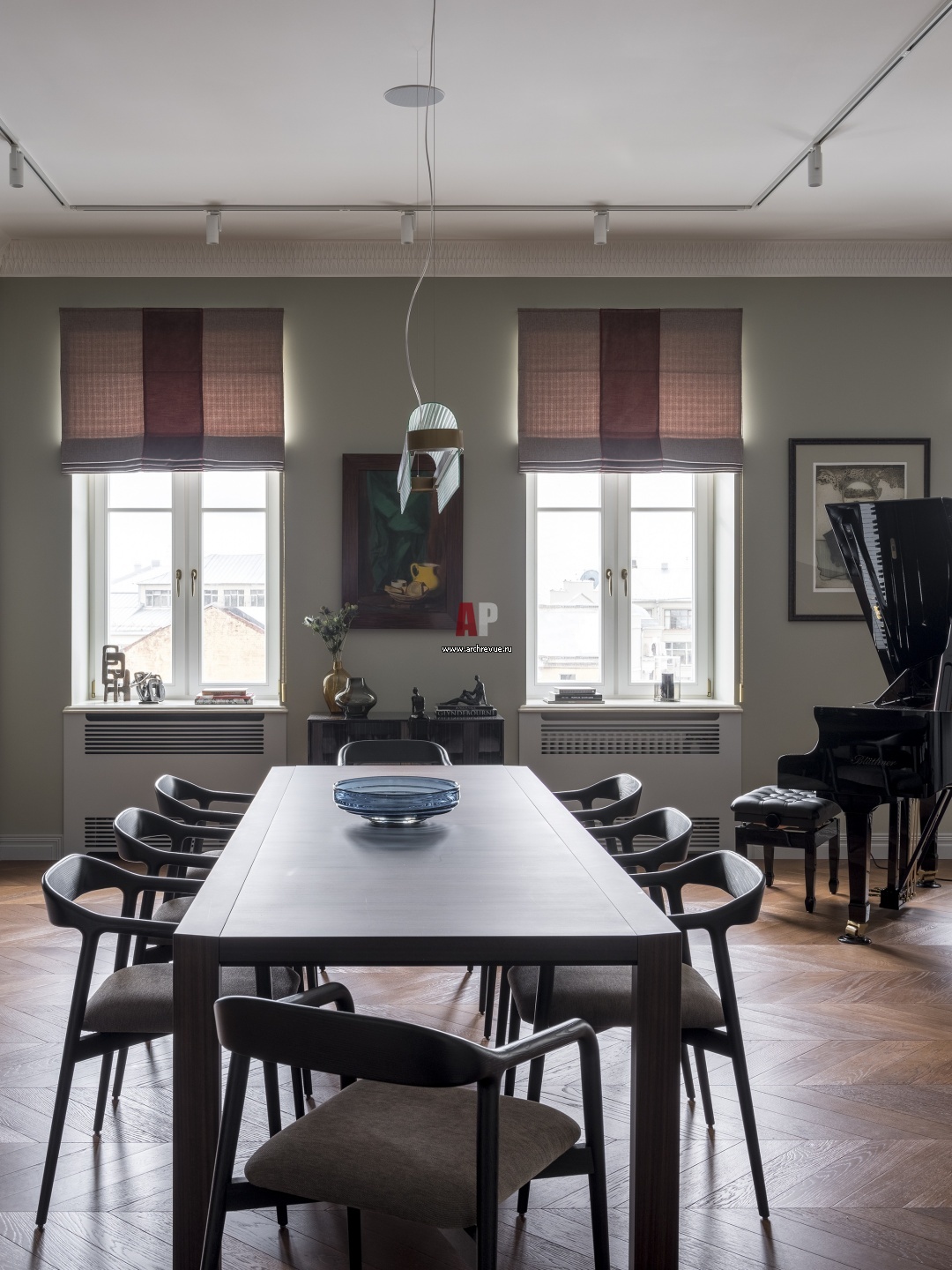 Заказчики любят принимать гостей. Обеденный стол Molteni &C на 12 персон включен в общую гостиную. Стулья, Horm. Светильник, Kundalini.