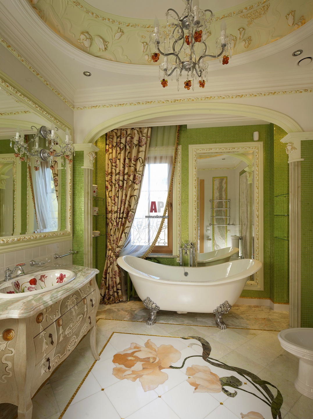 Декоративная тема детской ванной комнаты – тюльпаны. Пол украшен композицией из мозаики и каменных цветов.