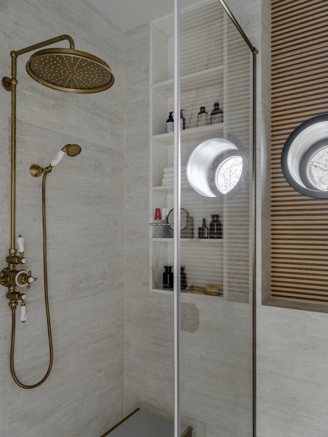 Дом в средиземноморском стиле. Санузел с декоративным круглым окном. Душевая стойка, Burlington.