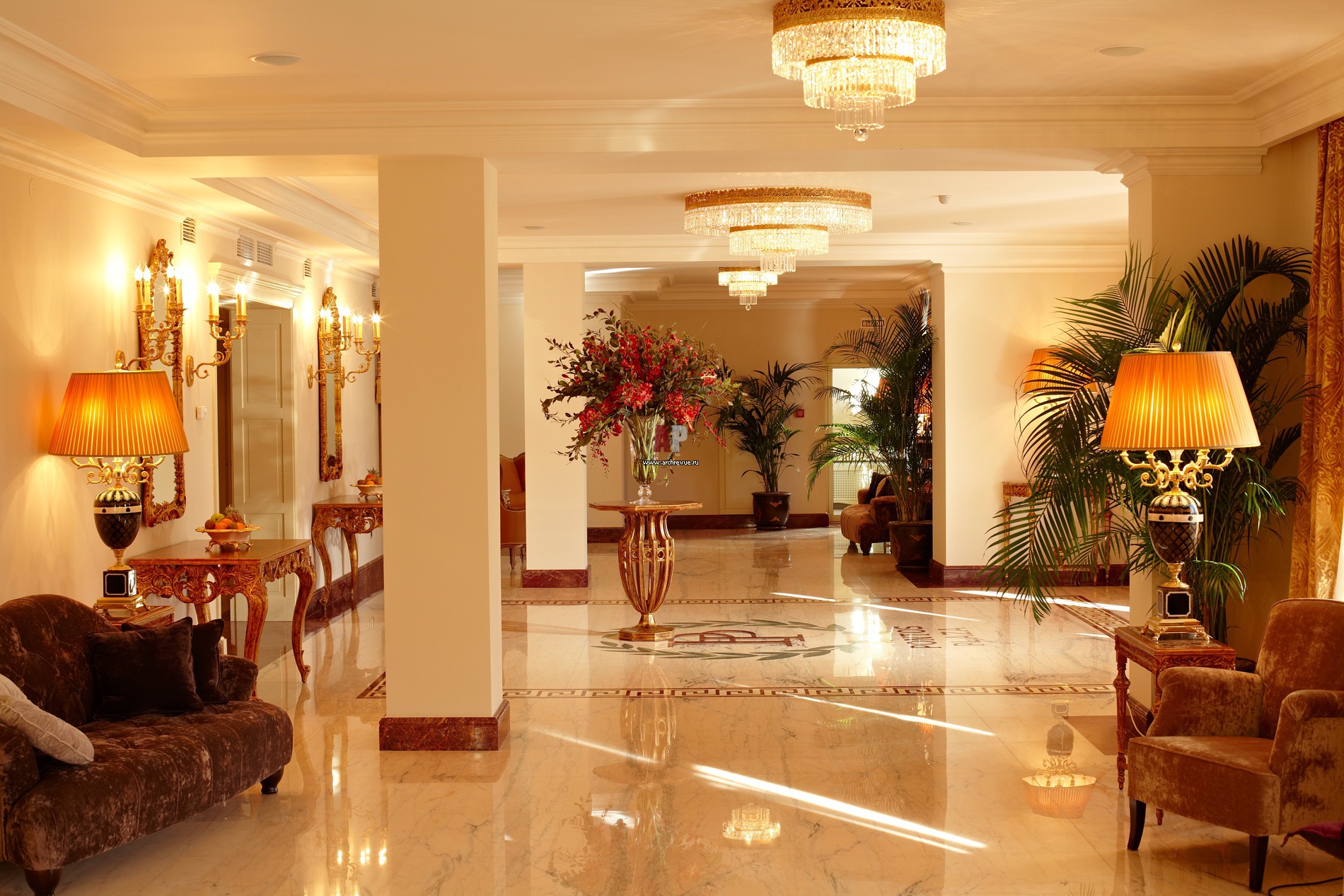 Парадный настрой при входе задают мраморные полы с панно, в котором читается логотип отеля. Тему поддерживают итальянская мебель в классическом стиле и хрустальные светильники.