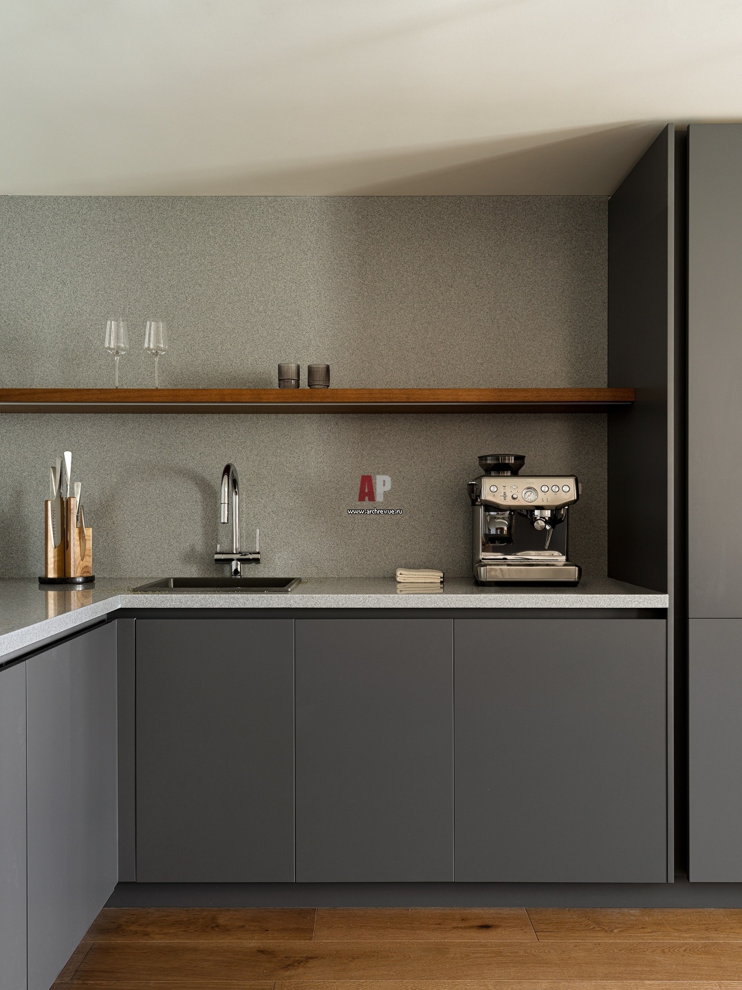 Общая гостиная имеет П-образную форму. Кухня расположена в своего рода нише, под скосом кровли.