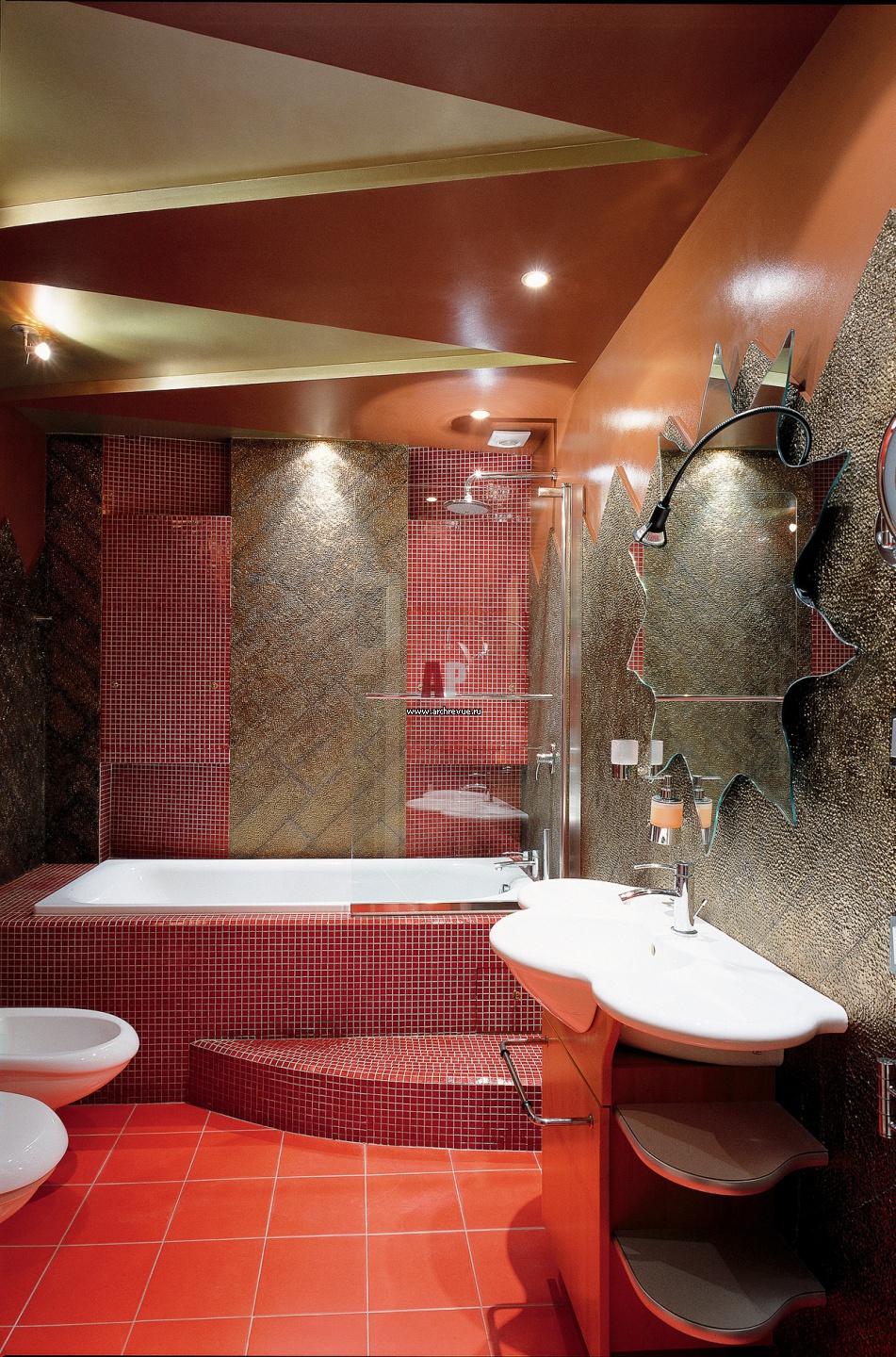 Красный санузел. Подиум для ванны облицован красной мозаикой. На стенах – плитка с фактурой жидкого золота. Зеркало в форме солнца с лучами.