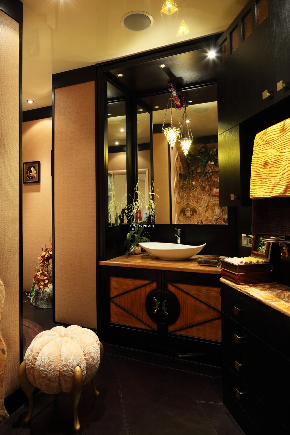 Шкафы в хозяйском санузле выполнены на заказ по эскизам архитекторов мастерами компании «Элит Интер». Дверцы украшают ручки в виде бронзовых ящериц. Стены зашиты панелями из кожи.