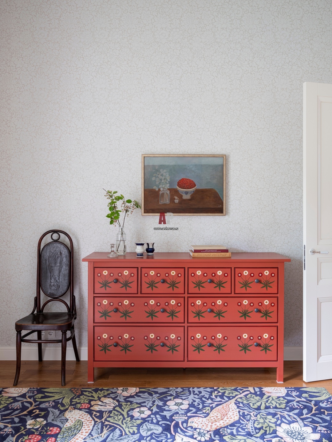 Хозяйская спальня. Комод «Икеа» украшен росписью по мотивам орнамента Уильяма Морриса «Маргаритки». Роспись, художник Светлана Федоскина. Над комодом – картина Тинатин Чхиквишвили.
